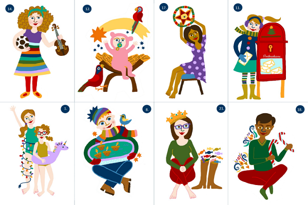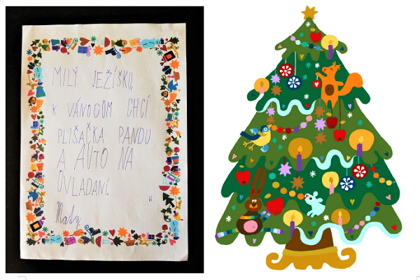 Určitě nebyla náhoda, že jsem se na vánočním jarmarku před pár lety setkala s výbornou ilustrátorkou Petrou Oringle Řehovou a pod jejíma rukama vznikly ilustrace podle fotek lidí, co mi příběhy poslali. Taky k postavám nakreslila bohatě zdobený vánoční stromek, kolem kterého si můžete z vystřižených postaviček vykouzlit mezinárodní betlém.
