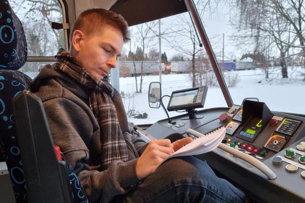 Zazněl gong a hlasatelka oznámila příjezd do zastávky. Tramvaj začala pozvolna brzdit, dokud úplně nezastavila. Pětice cestujících vstala ze sedadel, mladý pár po zastavení dokonce lehce zavrávoral, ale chlapec i dívka se udrželi na nohou a nespadli. Jakmile vystoupil poslední pasažér, Karolína opakovaně stiskla tlačítko zavření dveří a plynule zadávala jednotlivé stupně jízdy.
