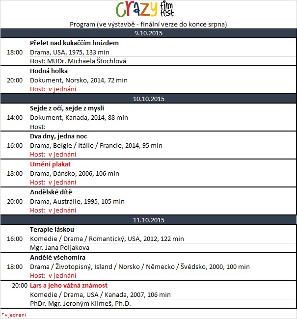 Festival se uskuteční 9. – 11. 10. 2015 v Řevnicích (Praha - Západ). Můžete se těšit na 9 filmů od klasiky v podobě Přeletu nad kukaččím hnízdem, přes norský „feel-good“ dokument o depresích až po islandský biják Anděl všehomíra. Každý film zasadíme do kontextu tím, že ho uvede jeden z předních českých odborníků na psychiatrii. A po filmu bude následovat workshop či beseda pro ty, kteří budou mít chuť se o tématu dozvědět více.