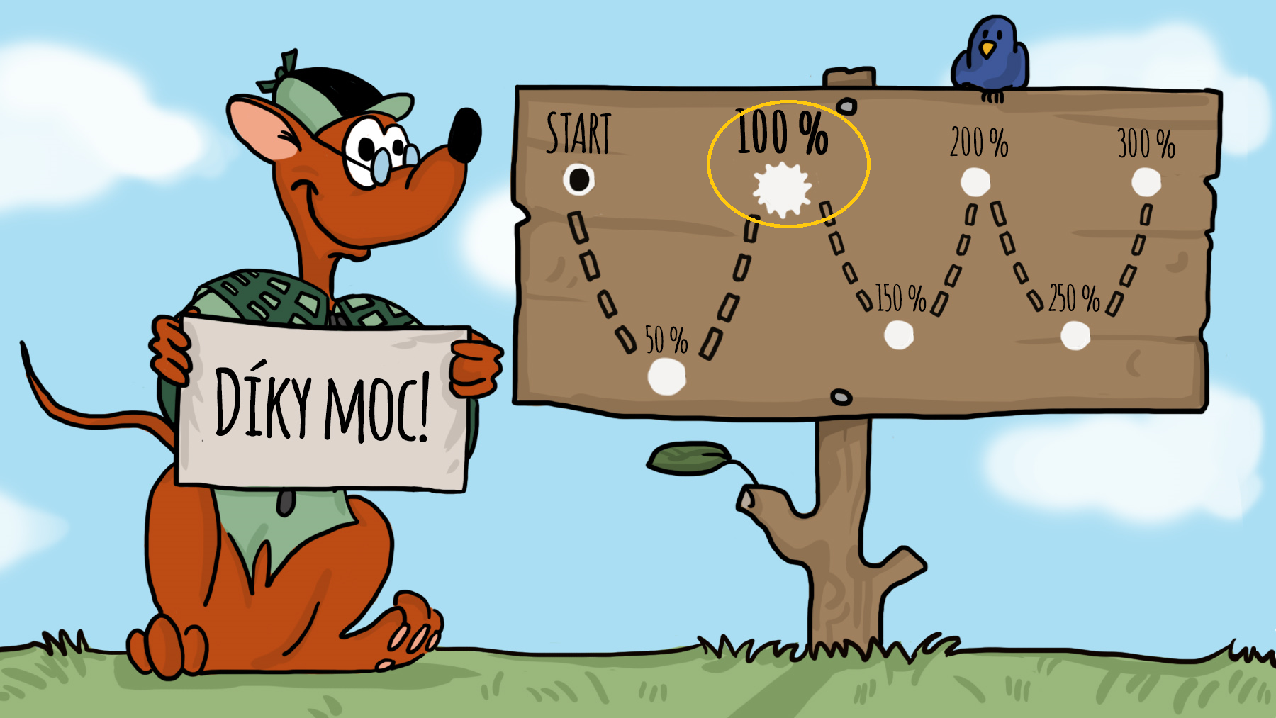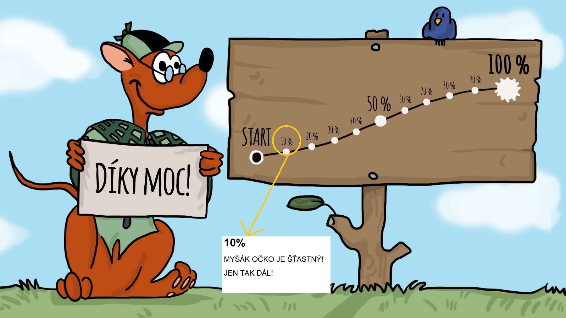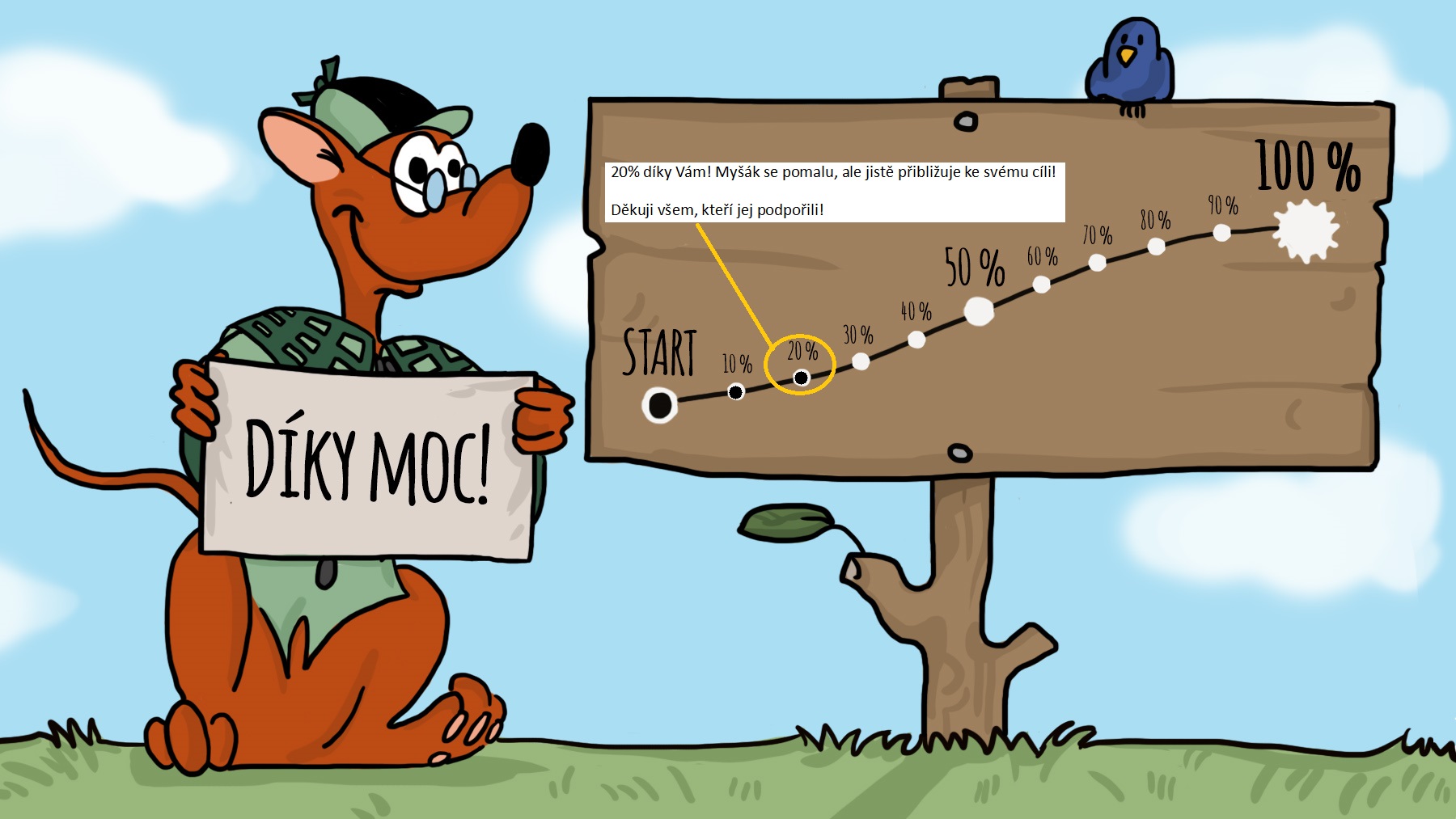 Vzhledem k tomu, že 100% je již překročeno (paráááádáá) a zbývá ještě 8 dní, každé další vybrané peníze budou použity na cd Písničky Myšáka Očka nebo audioknihu Myšák Očko.