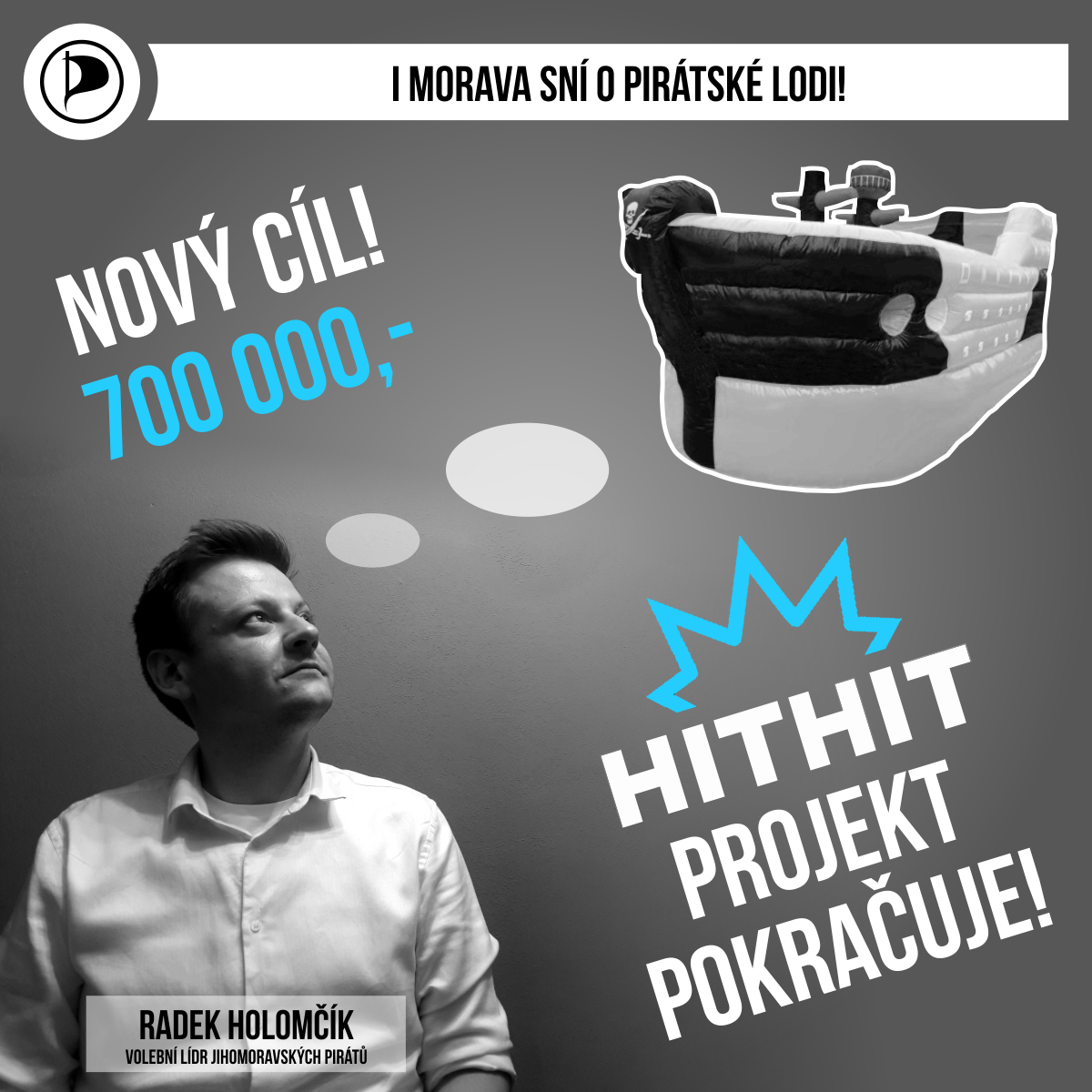1) Stanovujeme si nový cíl! Pokud se podaří vybrat přes 700 000 korun (dvojnásobek původní cílové částky), vyrazí Piráti s lodí i na Moravu. Nebude to ale loď solární, která popluje v Čechách a nemá šanci se na Moravu dostat, nýbrž velká Pirátská loď NAFUKOVACÍ, kterou necháme v našich "barvách" vyrobit. Tu postupně, pod velením skákajícího kapitána Radka Holomčíka, pirátského lídra Jihomoravského kraje, přivezeme do Brna, Vyškova, Blanska, Hodonína, Břeclavi a Znojma, kde si na ní společně (malí i velcí Piráti) užijeme spousty zábavy! Když se opět podaří vybrat více peněz, určitě budeme usilovat o "plavbu" na další místa na Moravě...