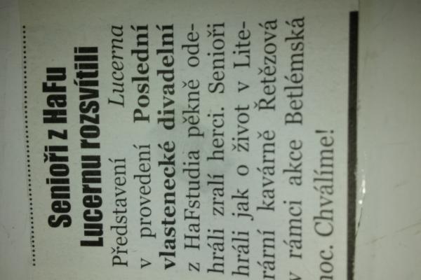 V roce 2015 jsme několikrát úspěšně veřejně uvedli Jiráskovu Lucernu, kterou se nám podařilo nastudovat a jsme na sebe náležitě pyšní! V sezóně 2015/2016 jsme hráli autorské dílo členů skupiny Málem zločin v šantánu. Jde o humorný, leč trošku napínavý příběh s detektivní zápletkou. Nechybí souborem oblíbené zpěvy a tance. Účinkovali jsme na festivalu Mezi ploty, v Pellého vile při festivalu Fresh senior, na pražské Kampě na festivalu Poupění Strýt tyjátr, v rámci Betlémské noci v Literární kavárně v Řetězové ulici a také v Malostranské besedě.