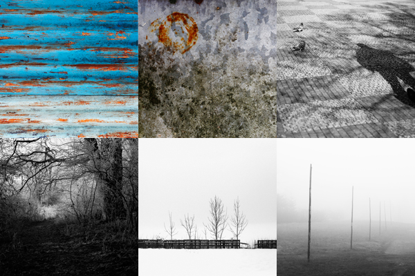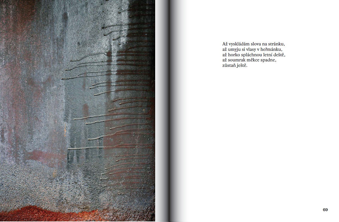 Fotografie obsažené ve sbírce se dají rozdělit na dvě kategorie: barevné, v zásadě snímky ze starých plechů (které na rozdíl od staré lásky krásně rezaví), zdí a vrat, a klasické černobílé. Většinou si po vyvenčení přinesu nějakou fotku a napadne mě k ní báseň. Jindy mě naopak napadne báseň a pak k ní hledám fotku. Jsou ovšem i případy, kdy si nepřinesu nic a nenapadne mě k tomu nic.