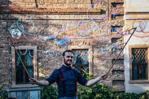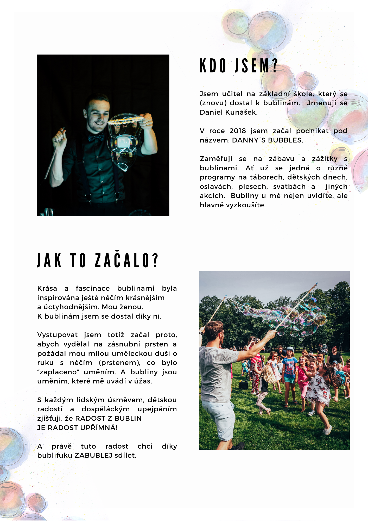 Nezapomenutelné bublinové představení je plné bublinových triků jako jsou: kouřové bubliny, hořící bublina, bublinový řetěz, kolotoč či pyramida. Vystoupení je vhodné do vnitřních prostor pro oslavy, plesy, večírky, dětské dny a další. Možnost programu po celé ČR, doprava v ceně.