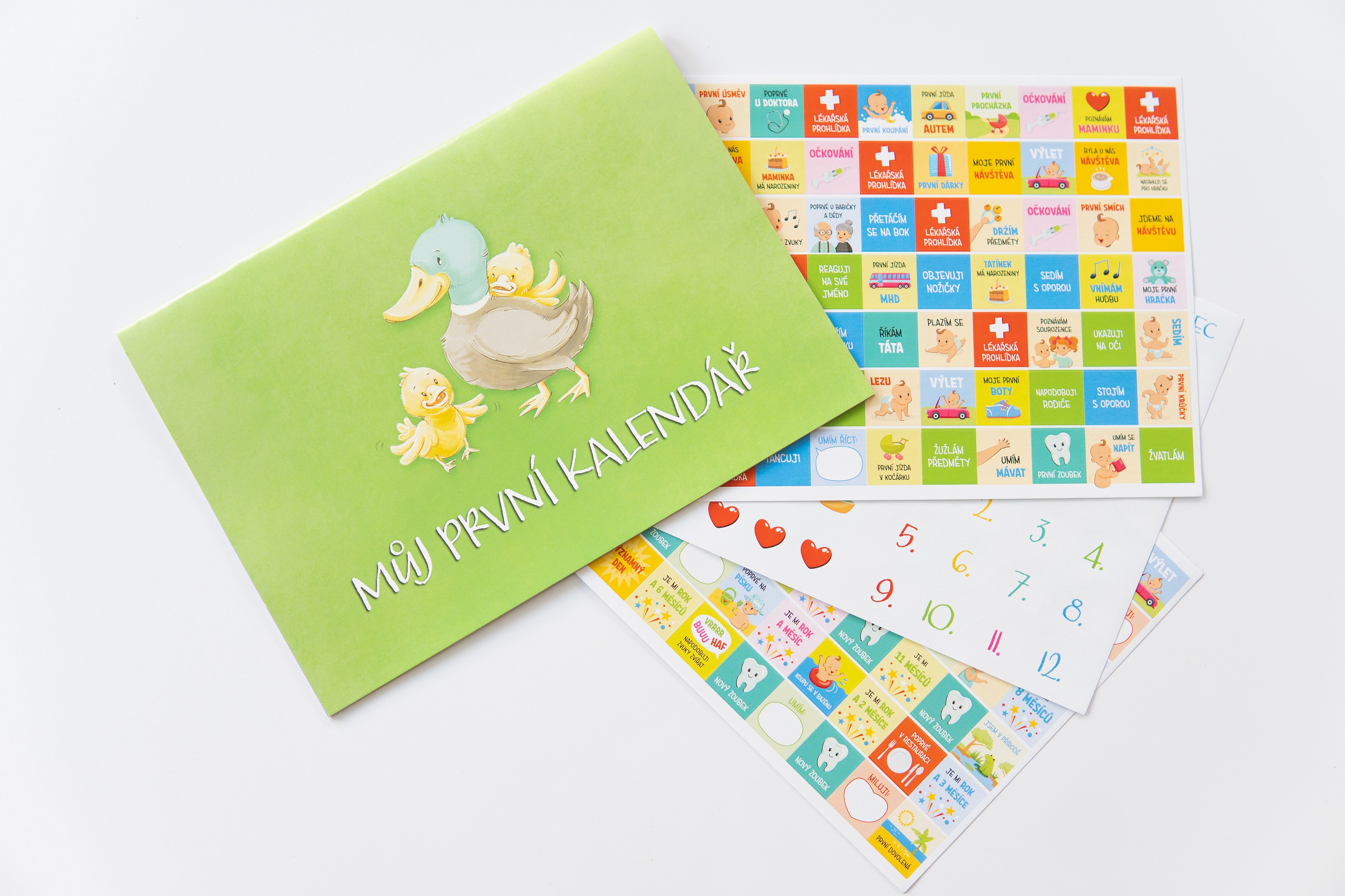 Můj první kalendář je unikátní samolepková knížka, která slouží pro zaznamenání všech krásných a nových okamžiků po narození dítěte. Obsahuje 12 listů, jeden na každý měsíc, s nedatovanými políčky pro každý den v měsíci. Do těch si rodiče zaznamenají zážitky, dovednosti a události svého miminka tak, jak se jim zlíbí. K dispozici mají v základních sadách 230 samolepek, které jim v tom pomohou. Pokud by ani to nestačilo, lze objednat i limitované sady nálepek, které nabízejí ještě více možností. Kromě nálepek mohou rodiče využít jakýkoli další způsob, který je napadne - do kalendáře se dá psát, kreslit nebo vlepovat třeba fotky. Jako bonus je pak na konci knížky prostor pro vzkazy - třeba od rodičů, od babičky a dědy, od sourozenců. Dohromady by tak Můj první kalendář měl tvořit jednoduchý nástroj k uchovávání vzpomínek na to nejkrásnější období, ke kterému stojí za to se vracet.