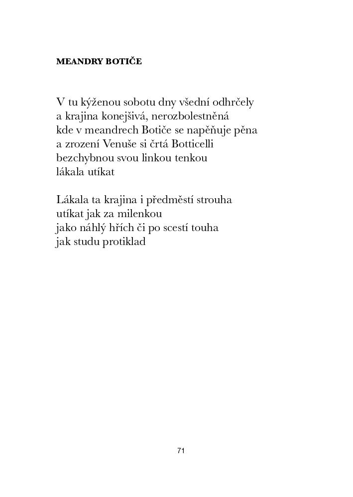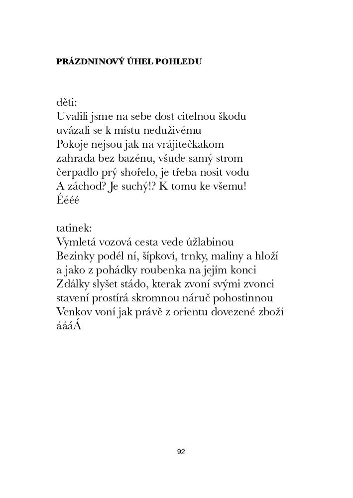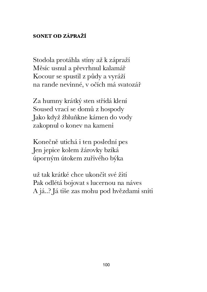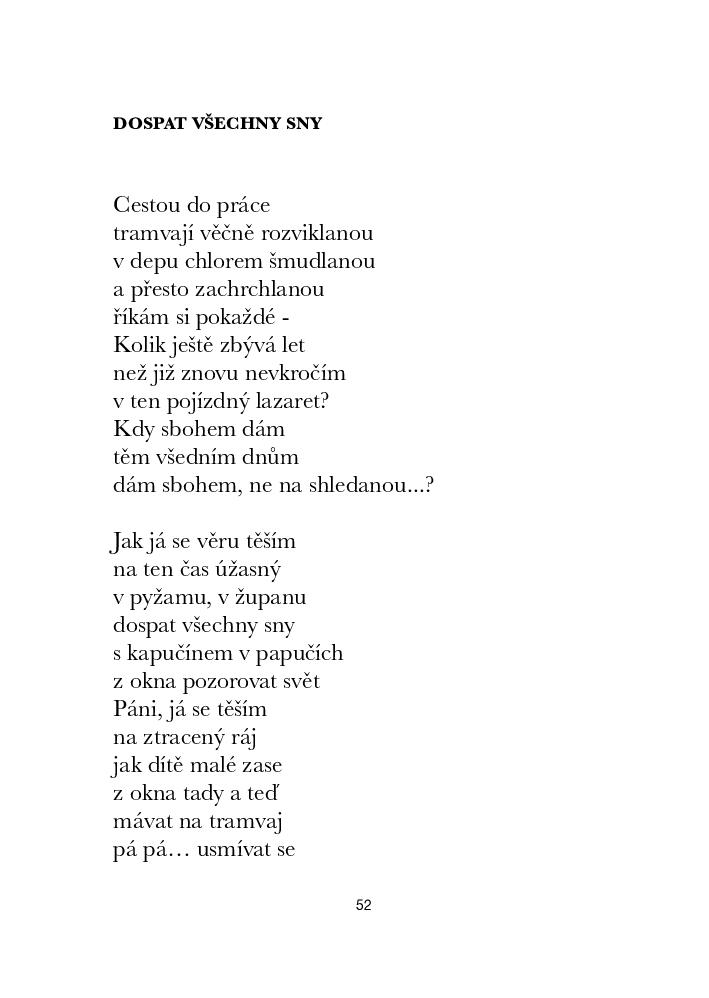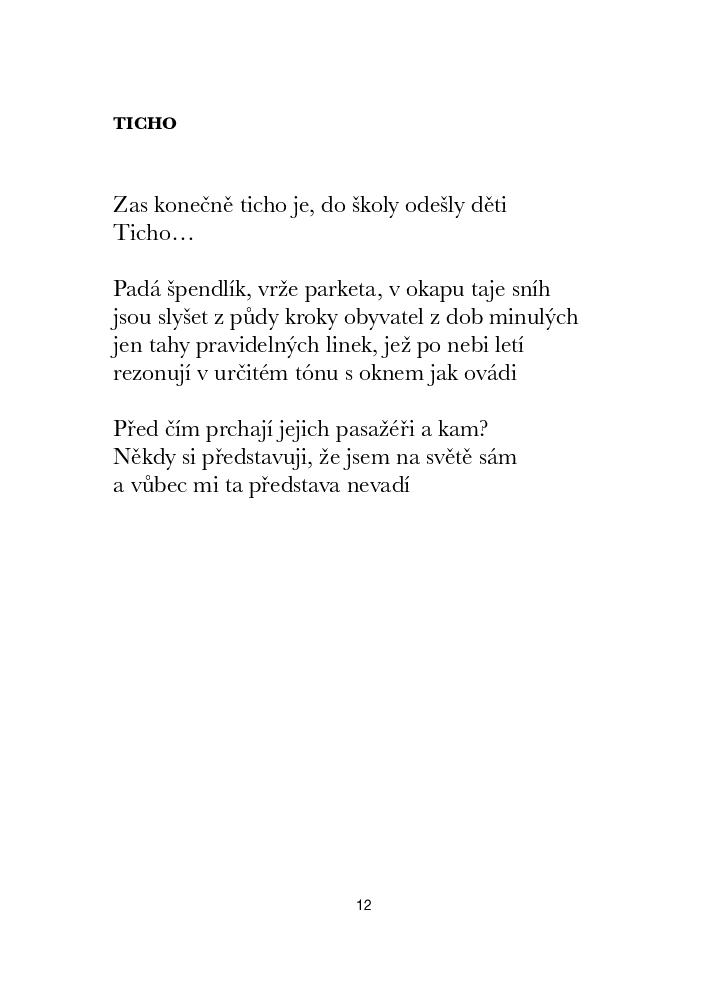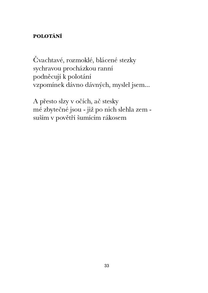 V rozjitřeném mladém věku jsem sepsal dvě básnické sbírky, které v letech 1995-96 získaly v Literární soutěži Šrámkovy Sobotky 1. cenu v kategorii 15-26 let - jako ocenění jsem tehdy převzal biostimulátory ztopořený karafiát a nažehlený grafický list. Obě sbírky jsem pak později vydal vlastním nákladem a rozdal blízkým lidem. Jak invence přicházela a odcházela, psal jsem nadále, přestože velmi nesoustavně a sporadicky, do šuplíku. Občas jsem otextoval píseň svoji či svých muzikantských přátel, uložil si pár drobných básní či nápadů pro někdy... Až v posledních čtyřech letech jsem se k poezii vrátil s větším a neodbytným zápalem, díky kterému dozrál čas na vytvoření této sbírky básní.