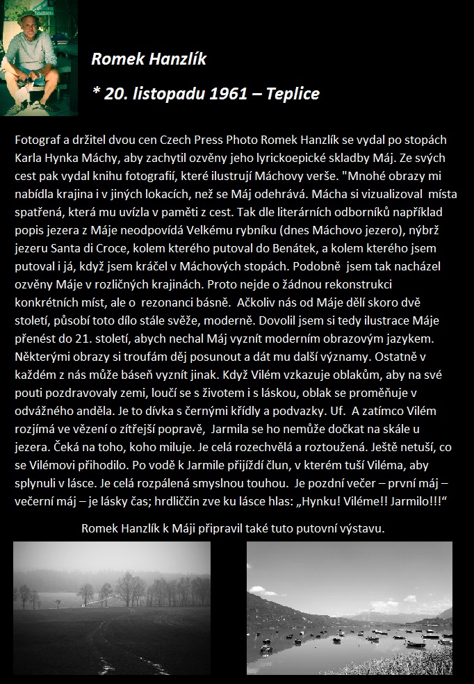 Tento měsíc (říjen) je Máj k vidění v Kolíně (MSD), v Doksech (Památník K.H.Máchy) a v Praze od 8.10.2018 v Centru Fotoškoda ve Vodičkově ul.