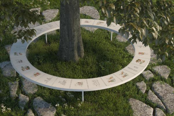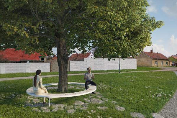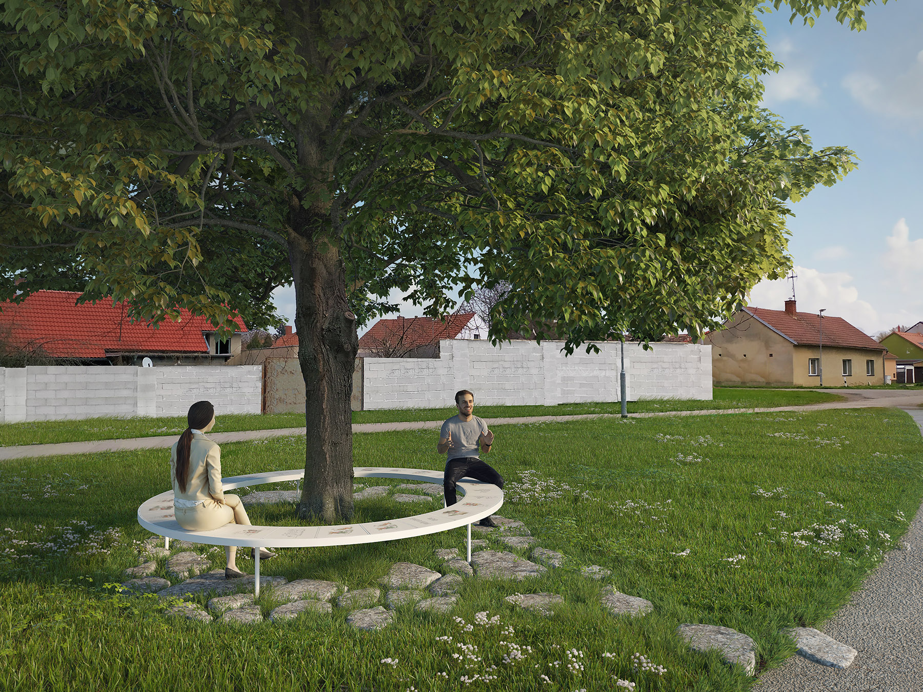 A právě motiv lavičky, který se obrázcích tak často objevuje, se jeví pro podobu památníku víc než vhodný. Pro její umístění jsme vybrali prostranství pod starou lípou v historické části města - Bačov (www.pecky.cz). Zdejší, téměř vesnická atmosféra, nejlépe ladí s náladou Renčínovy specifické poetiky.