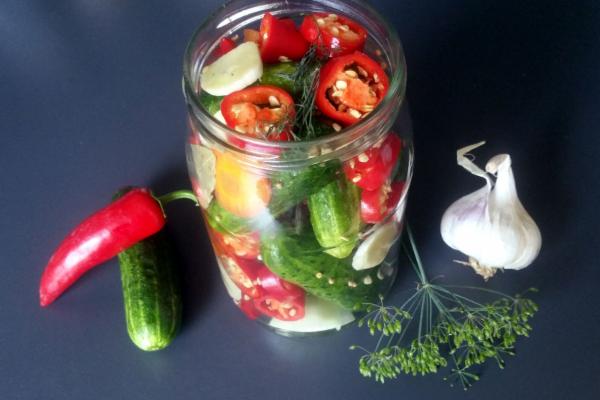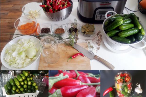 Okurky pro změnu nakládáme s papričkami ve sladkokyselém nálevu a palčivost regulujeme zvolenou odrůdou chilli papriček. Překvapivě po uležení jsou ostřejší okurky než papričky samotné. A lák, och ten lák, dokonalý vyprošťovák po prohýřené noci.