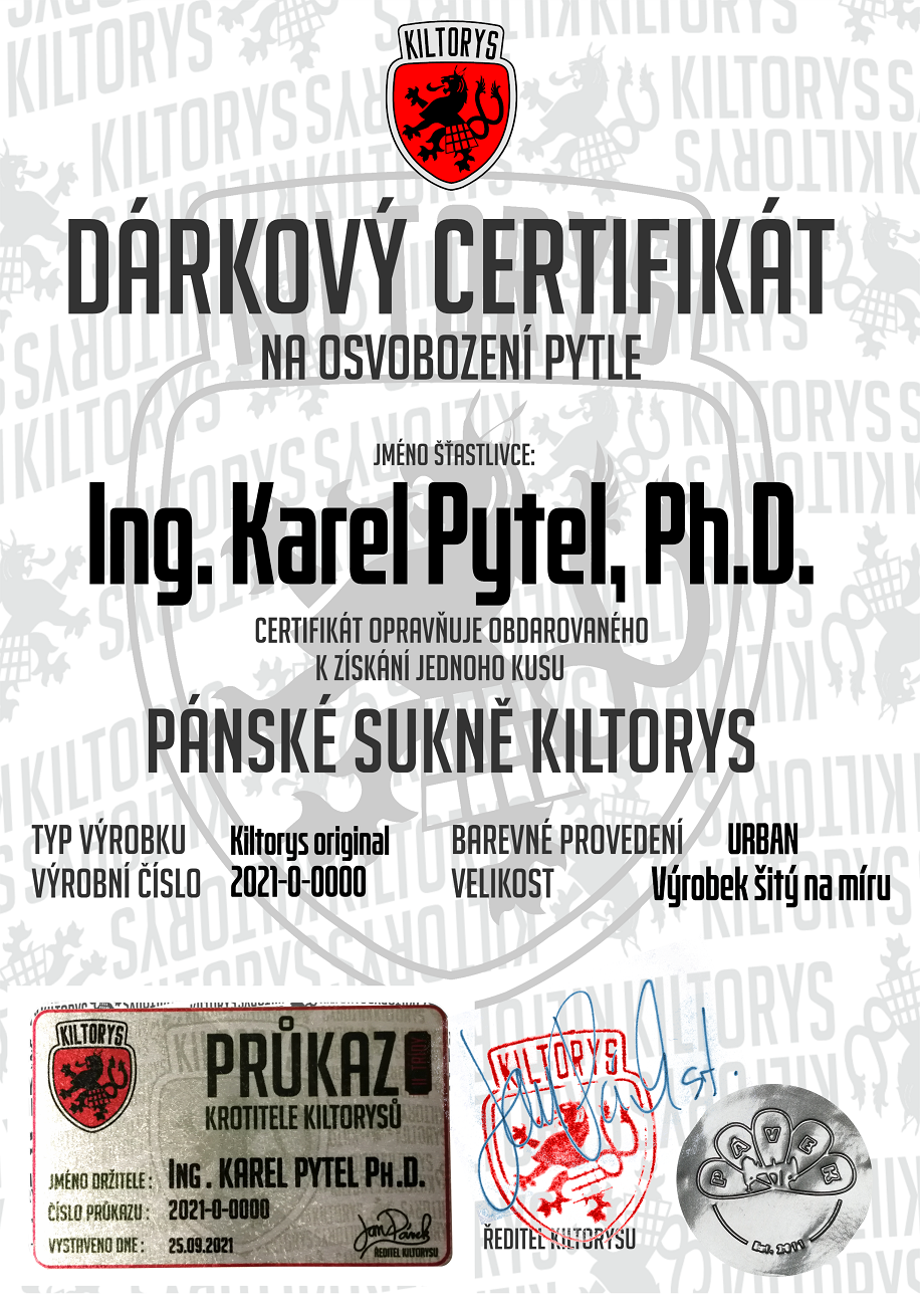 Součástí certifikátu je i krásný "Průkaz krotitele KILTORYSů" - oboustranně potisknutá PLECHOVÁ průkazka velikosti kreditní karty, která nejen suprově vypadá ale dává držiteli právo zastavit se na exkurzi v naší šící dílně, ale navíc poskytuje stálou 5% slevu celý sortiment eshopu www.kiltorys.cz