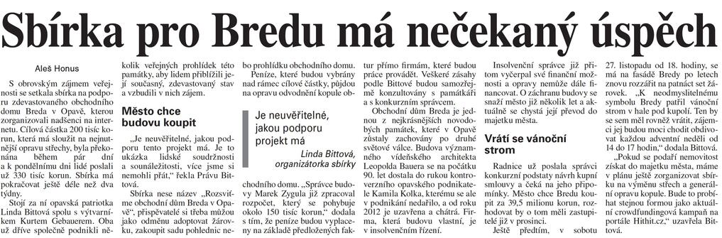 Společně s Kurtem Gebauerem jsme se rozhodli uspořádat sbírku na nejnutnější opravy kulturní památky obchodního domu Breda v Opavě. A současně rozsvítit tento objekt o Vánocích, jako poděkování podpory veřejnosti. Pojďte do toho s námi!