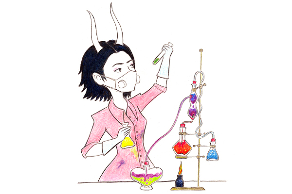 Po jídle tedy alchymistku hned následovali do laboratoře. Měla tam poličky s různými nádobami. Přibližně uprostřed stál stůl se třemi židlemi. Sedli si a vtom si oba čerti uvědomili, že jim je zase špatně. Skořice Skleničková měla kyslíkovou masku. Čert běžel k umyvadlu, ale Uhlař už to nestihl. Rozkašlal se, ale naštěstí ho Skořice odtáhla na chodbu. Za pár minut mu bylo zase dobře. Alchymistka jim dala kyslíkové masky, a tak mohli pokračovat. Ukázala jim pár důležitých lektvarů a otevřela svůj malý cestovní mrazáček. Vyndala z něj čokoládu tvrdou jako kámen. Měli za úkol ji rozmrazit podle návodu. Když se jim to povede, můžou si čokoládu nechat. Alchymistka vyndala potřebné lektvary a řekla jim instrukce. Nějakou dobu přelévali všechno možné do velké sklenice. Alchymistka se mezitím snažila vymyslet ten nápoj lásky, ale vůbec se jí to nedařilo. Ani Luciferova pověstná Kniha lektvarů lektvarů, která byla jen jediná na světě a kvůli které vlastně Skořice přijela do jejich pekla, jí nijak nepomohla.