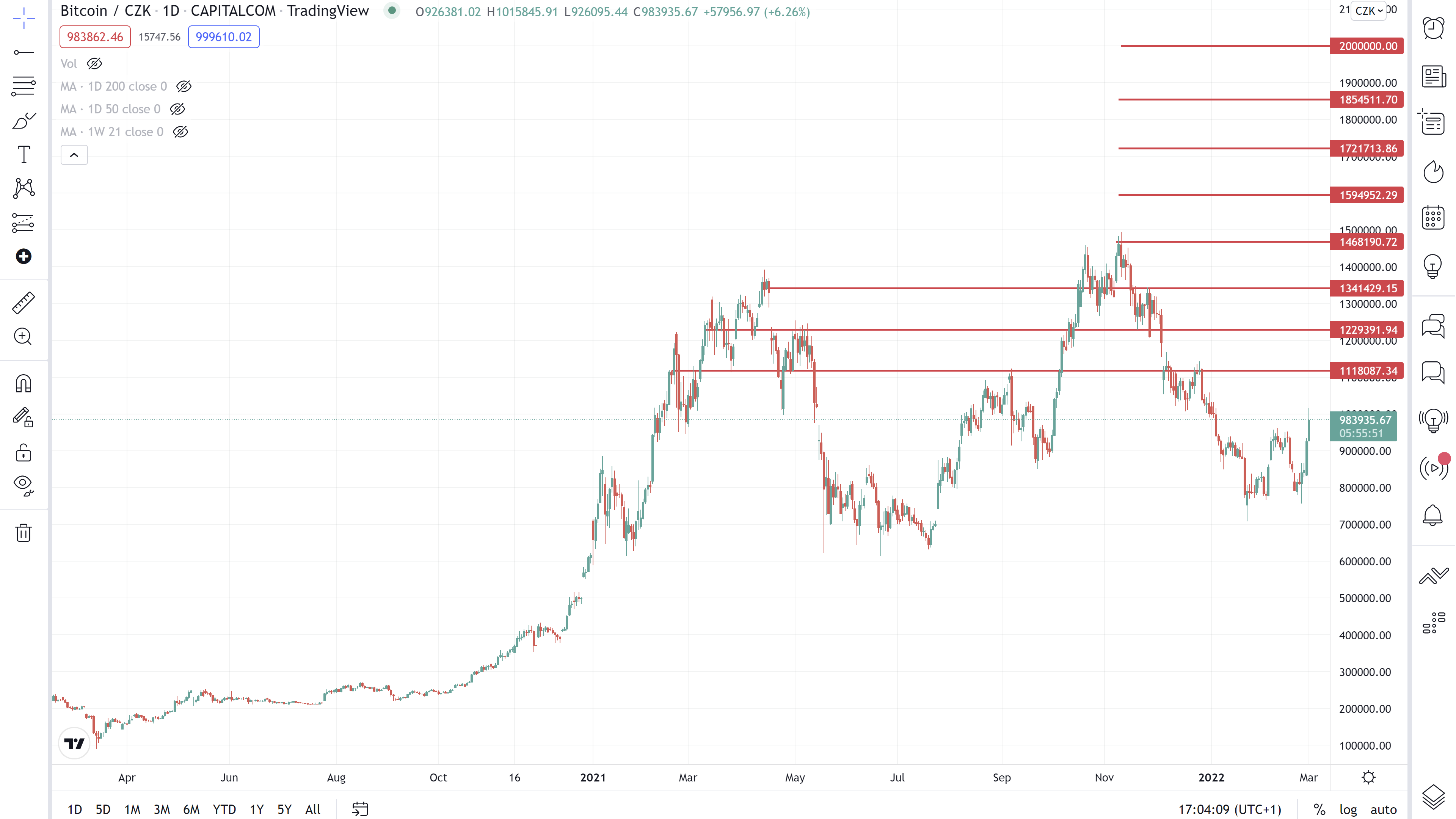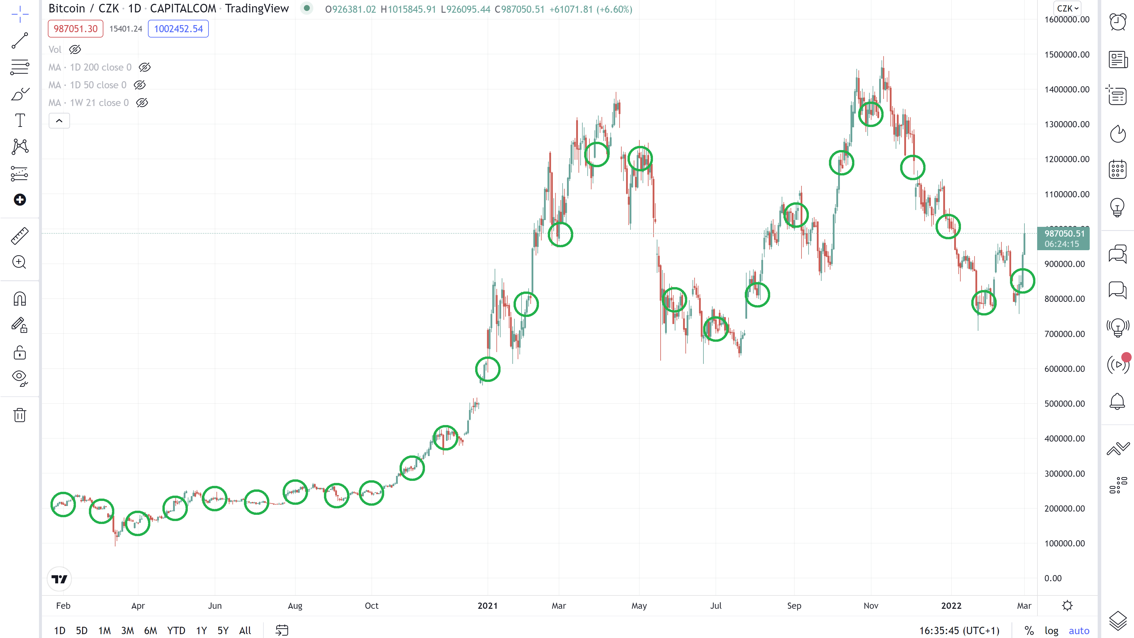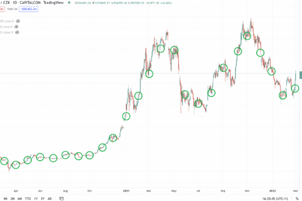 450 000 Kč - automatizovaná exit strategie s následnými dokupy při poklesu ceny