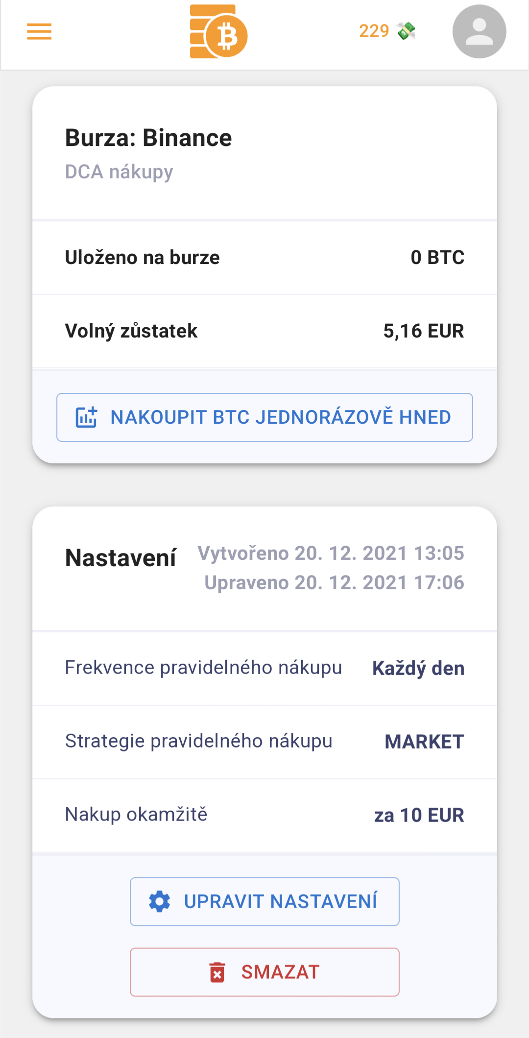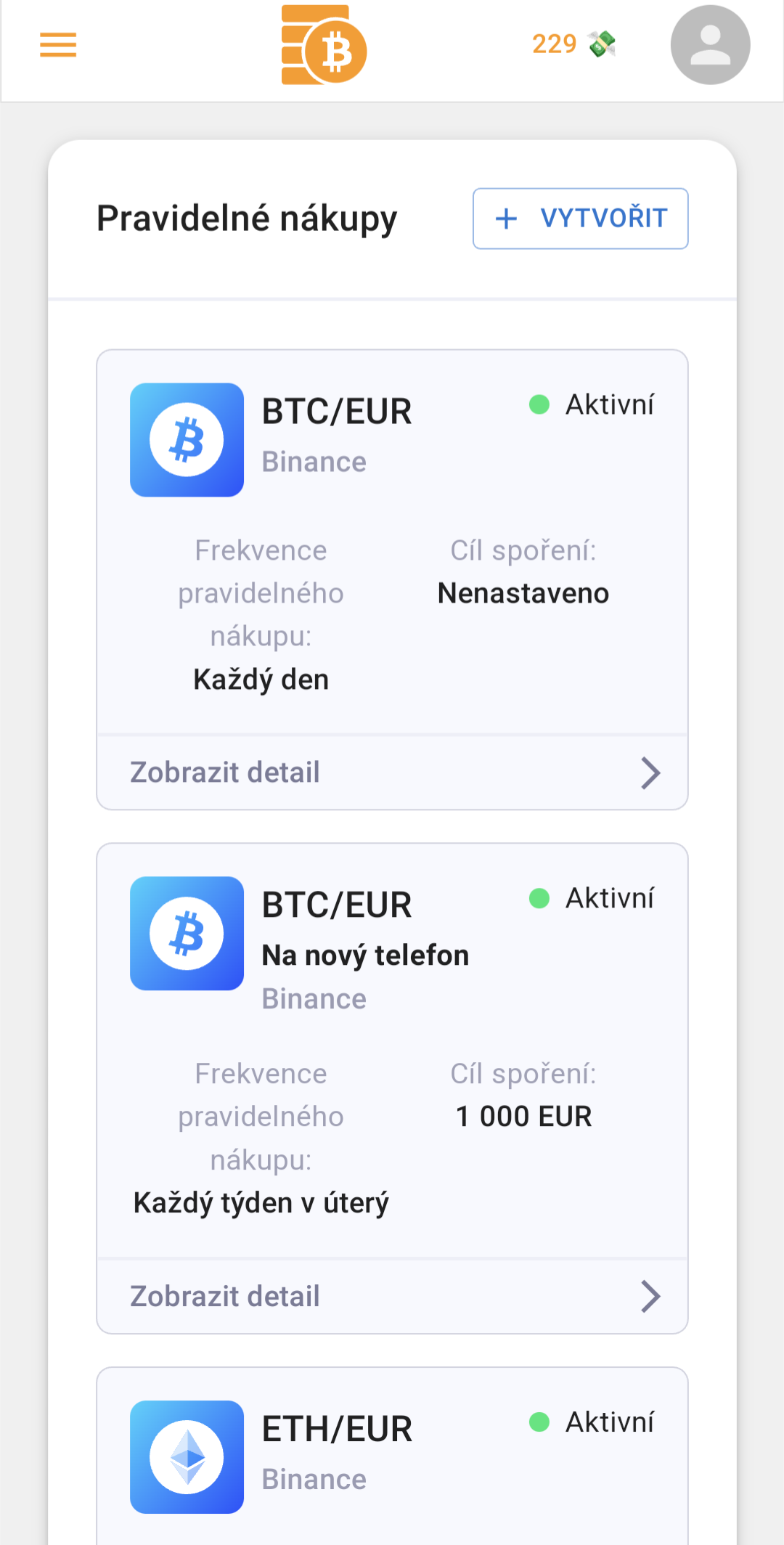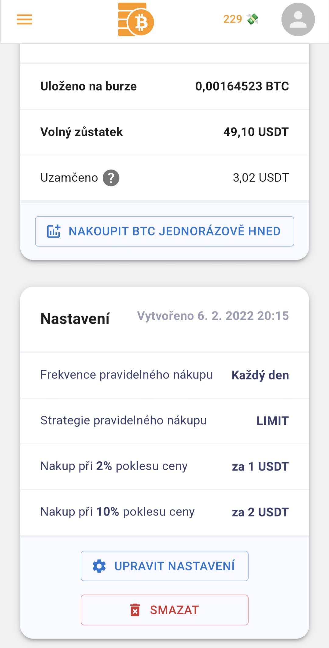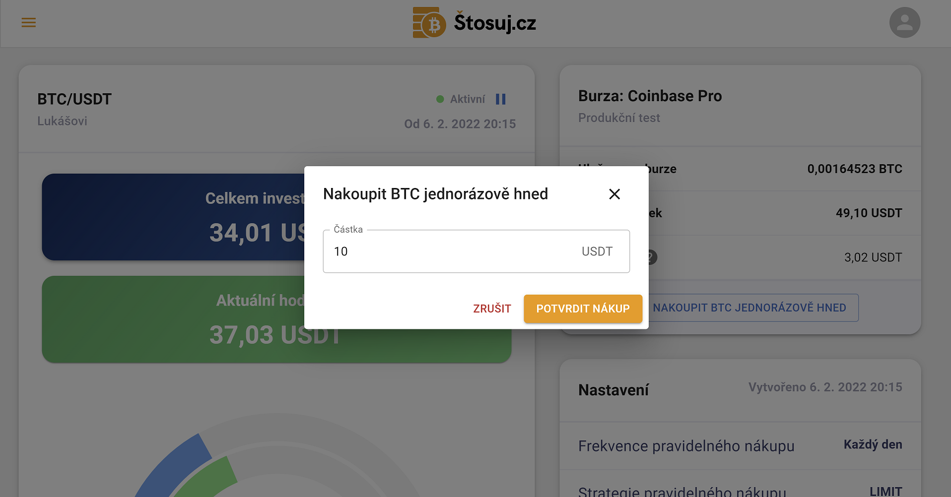 Štosuj.cz funguje jako samostatný nástroj pro nastavení pravidelných nákupů a exit strategie, samotné obchody ale probíhají na propojených burzách na vašem vlastním účtu.