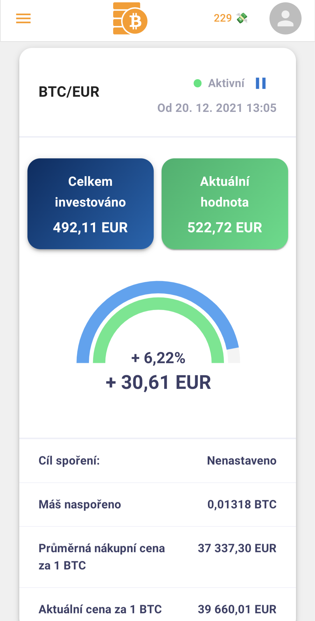 Aplikace vám ukáže přehled investované částky, aktuální hodnoty a vývoj v čase.