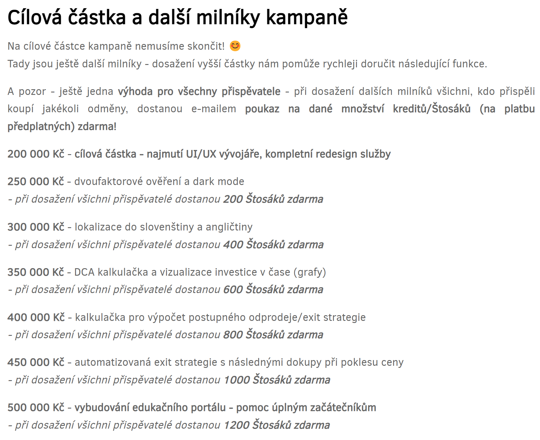 Připomínám, že v detailu kampaně máme uvedené i rozšířené cíle/milníky a spojené extra odměny v podobě kreditů pro platbu předplatných pro všechny Hithit přispěvatele, pokud na tyto milníky dosáhneme. Při dosažení dalších milníků tak všichni dostanete extra Štosáky! :) Koukám, že první rozšířený milník 250 000 Kč se již podařilo dosáhnout, takže všichni přispěvatelé dostanou extra kupón na 200 Štosáků zdarma, super!