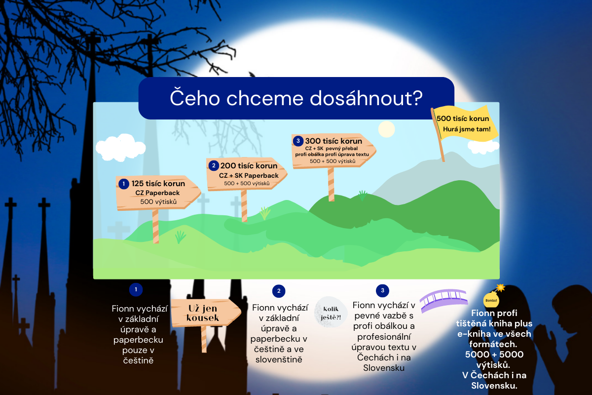 Cílová částka je nastavena postupně tak, aby kniha na začátku alespoň vyšla. To znamená v základní úpravě, v paperbacku a pouze v češtině pro oba trhy. Při vyšší dosažené částce by se už podařilo knihu vydat v České republice i na Slovensku. Tam i tam v nákladu cca 500 kusů, pořád však v základní úpravě. Pokud by se nám podařilo jít ještě o krůček výše, byla by kniha sice stále v nízkém nákladu, zato alespoň v profi úpravě a v pevné vazbě a přebalu. No a pokud se podaří vybrat maximální cílovou částku, náklad se navýší a román by mohl spatřit světlo světa i ve všech formátech e-knihy. To vše s pěkným přebalem, profesionální úpravou textu - zkrátka kniha jako z vydavatelství.
