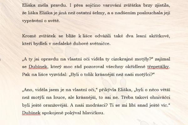 Eliška je liška zvídavá, a tak není divu, že jí rodný les nestačí. Na konci léta se tak loučí se svojí rodinou, nejlepším kamarádem zajíčkem Kryšpínem a vydává se do světa. Tam potkává spoustu zvířecích kamarádů, setkává se s lidmi a při svém putování se seznámí také s lesními skřítky Dubínkem a Modřínkem (tím se vyplní přání mé dobré víly sudičky:-)).