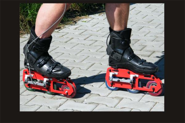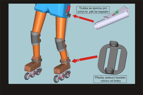 Každý podvozek těchto bruslí obsahuje tedy 3 kolečka o průměru 105mm z nichž poslední 2 jsou brzditelné obdobným způsobem, jako u bicyklů. Na disky zadních koleček dosedají brzdové špalíky uchycené v čelistech a od nich vedou při vnějších stranách nohou směrem k pasu bowdeny s lanky. Ty v oblasti kolen fixují k nohám kolení chrániče, takže při jízdě nikde nepřekáží a u pasu jsou ukončeny brzdovými pákami, které pomoci speciálních spon drží zasunuté za lemem kalhot nebo kapes.