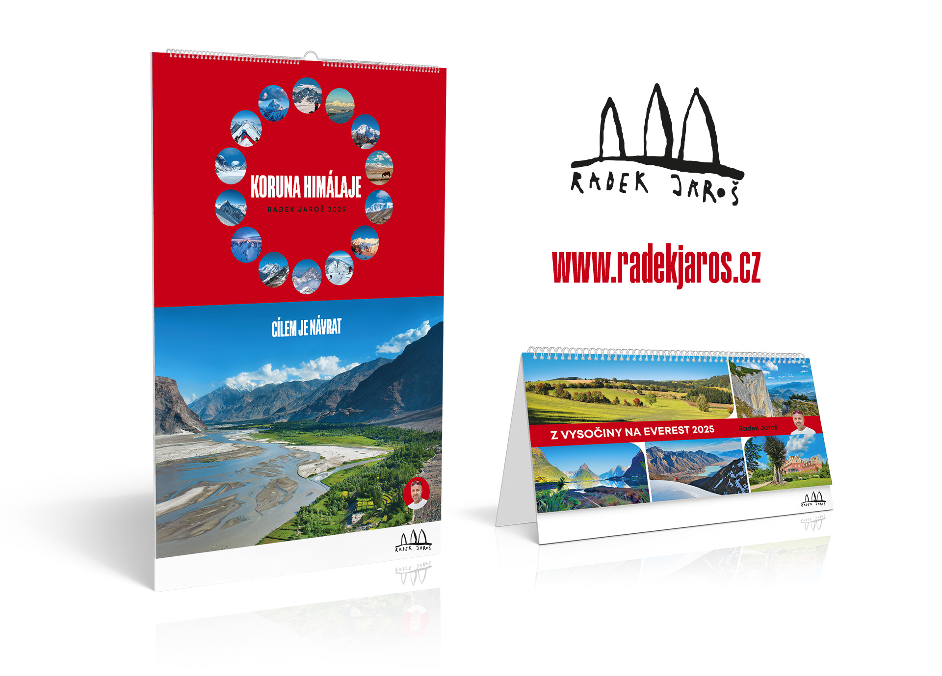 Stolní kalendář 2025 s titulem Z VYSOČINY NA EVEREST je pak průřezem fotografií z celého světa. Radek na tréninku, ve svém volně i na expedicích neustále fotografuje. Každý snímek má svůj příběh. Symbolicky začíná pouť na rodné Vysočině a přes různé světové lezecké, vodácké, turistické a další oblasti končí v nejvyšším světovém pohoří.