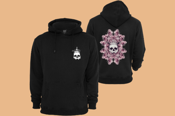 Takže nejprve existují pouze dvě položky, tričko a mikina s kapucí, obě jsou k dispozici v černé nebo bílé barvě se stejným stylem, na přední straně, malé lebce a celozadu. Experimentujeme s jinými barvami, ale zatím jsou k dispozici pouze tyto dvě. Při jednání s doručovacími službami najít nejrychlejší a nejdostupnější.