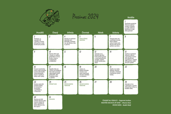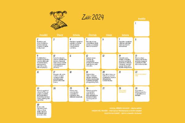 Každý měsíc přináší kalendář nové téma, novou oblast k rozvoji a je doplněna mými ilustracemi odpovídajícími ročnímu období nebo jednotlivým významným dnům daného měsíce, které si děti mohou sami vybarvit.