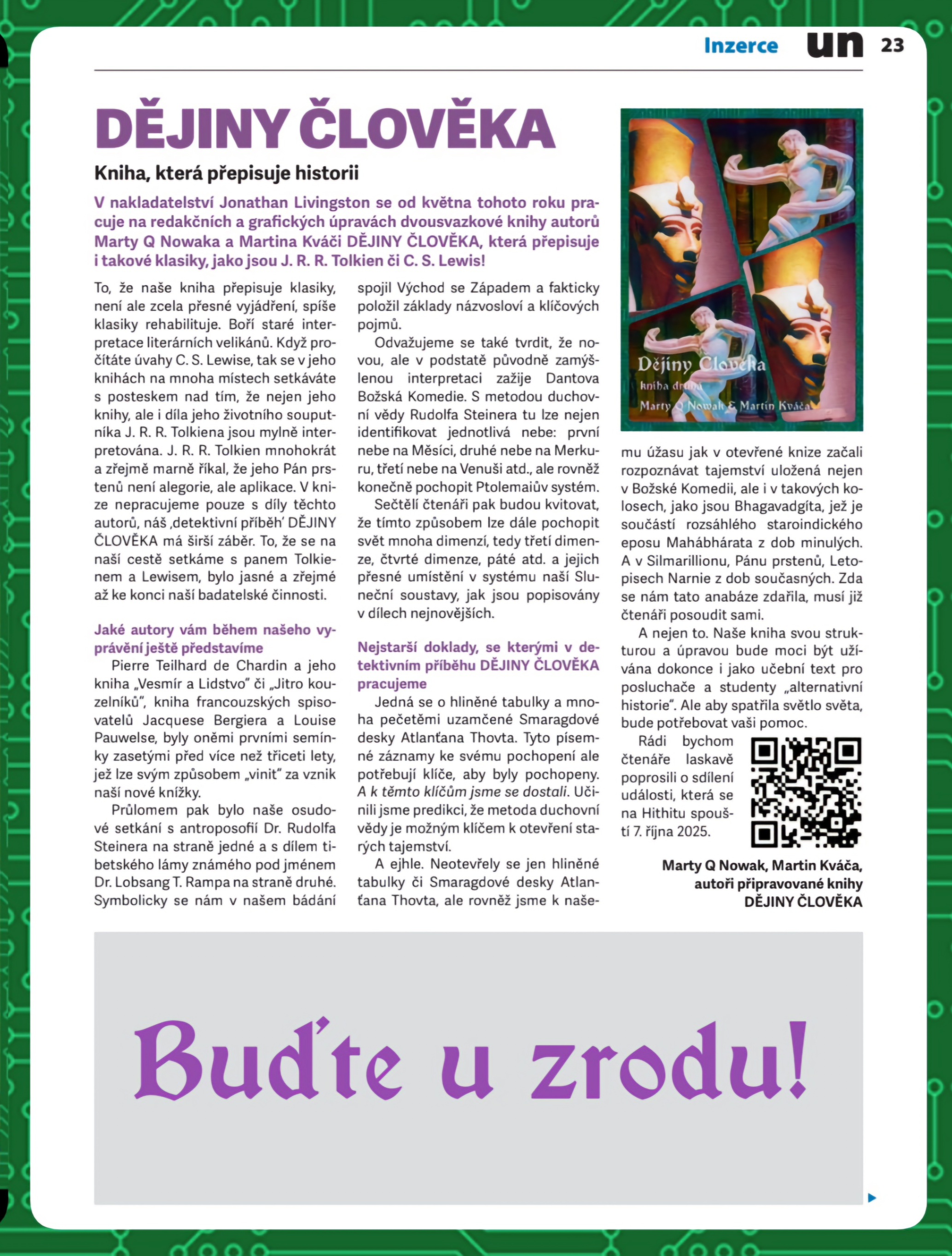 Buďte u toho! Staňte se úžasnými mecenáši! Buďte u zrodu knihy Dějiny Člověka, jež má ambici přepsat dějiny Současného Člověka tak, jak je doposud známe! Dvousvazkové vydání je detektivním příběhem o tom, s jakým záměrem vznikl Současný Člověk.