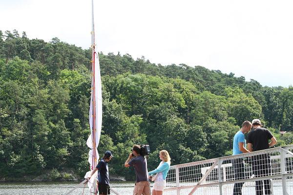 Musím říct, že rozložit loď, převést ji z haly na přehradu a spustit na vodu bylo 15 hodin usilovné práce, ale vše jsme zvádli a tak mohl katamarán z plastových lahví vyplout před zraky televizních diváků poprvé na vodu... ZÁZNAM Z ARCHIVU ČESKÉ TELEVIZE