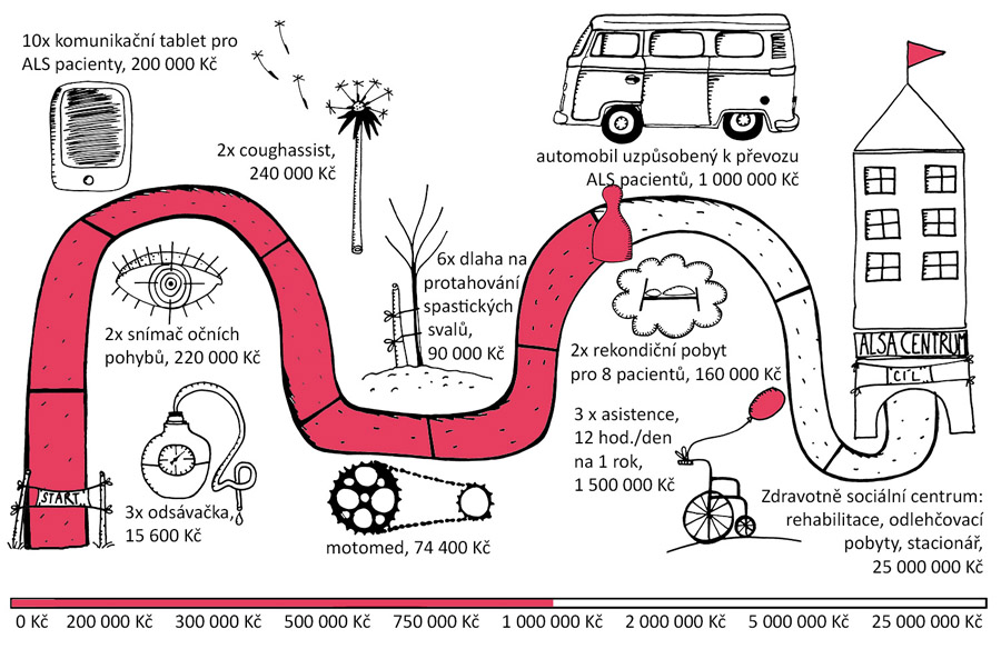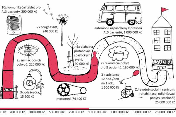 Když od Vás dostaneme milion, nakoupíme nejpotřebnější vybavení do naší půjčovny. Nejnutněji potřebujeme snímače očních pohybů, odsávačky, dlahy na protahování spastických končetin, motomed, přístroje Coughassist a komunikační tablety. A ještě z této částky budeme schopni zajistit rekondiční pobyty. Ale když dostaneme víc, koupíme další potřebné pomůcky a vybavení, které nám pomohou uspokojit všechny potřebné, uspořádáme školení pro fyzioterapeuty, koupíme auto s plošinou na převoz pacientů a třeba i prostor pro naše vysněné centrum....