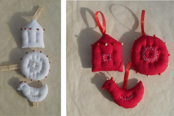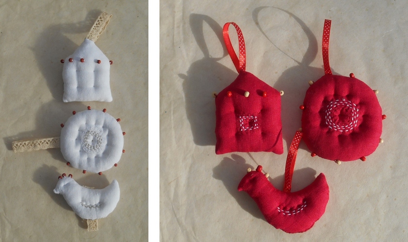 Sada tří interiérových ozdob, ručně vyšívaných a zdobených korálky. Rozměr ozdoby je cca 7x6 cm: