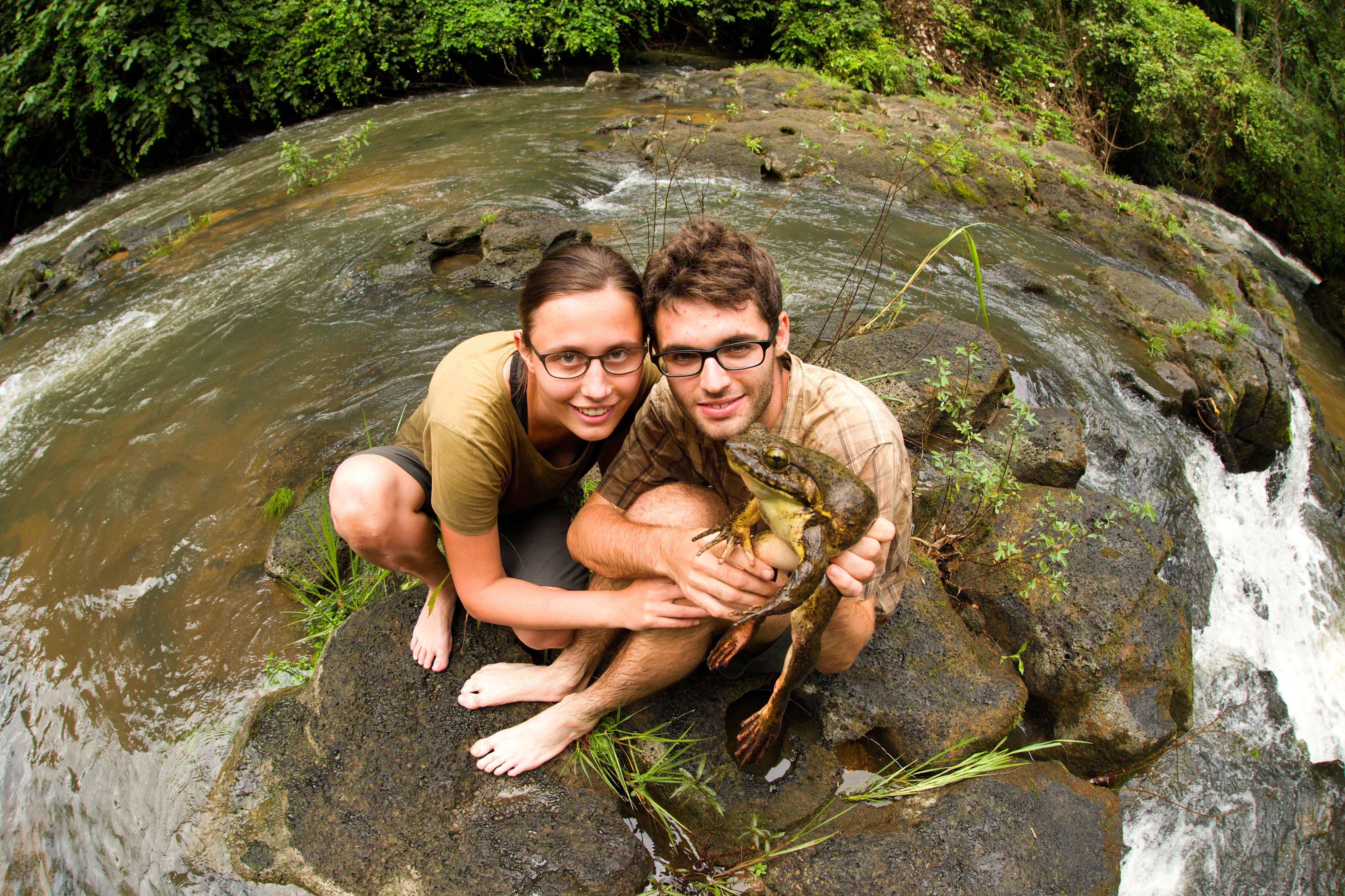 Matej a Zuzana v Kamerunu s největší žábou světa - veleskokanem goliáším vážícím zhruba 2,5 kilogramu.