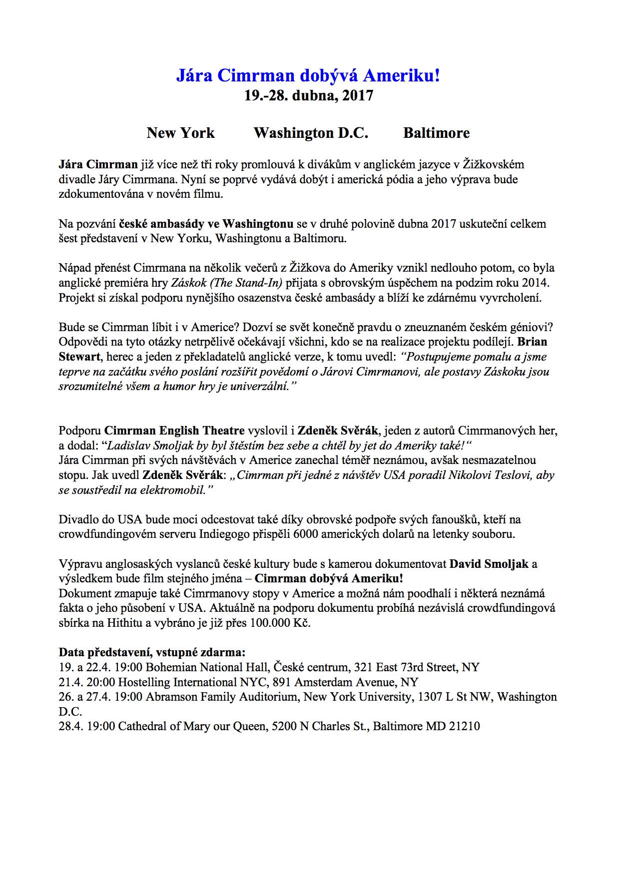Samozřejmě nevíme, jak bude znít odpověď diváků z New Yorku, Washingtonu a Baltimore. Ale už teď víme, že těmhle světoběžníkům Jára Cimrman jejich životy změnil. Místo Denveru, Toronta či Londýna zakotvili v Praze na Žižkově. A místo Richarda III. nebo strýčka Váni hrají Vavrocha a podruha Bártu. Teď se své osudové životní rozhodnutí pokusí před svými krajany obhájit. A přesvědčit je, že tenhle český objevitel dvojdílných dámských plavek a úlekové fixace za to stál…