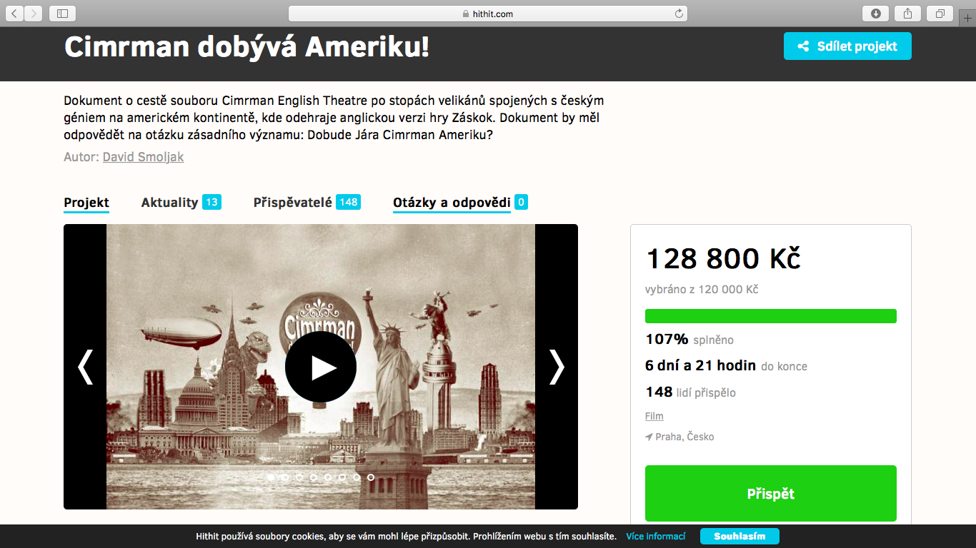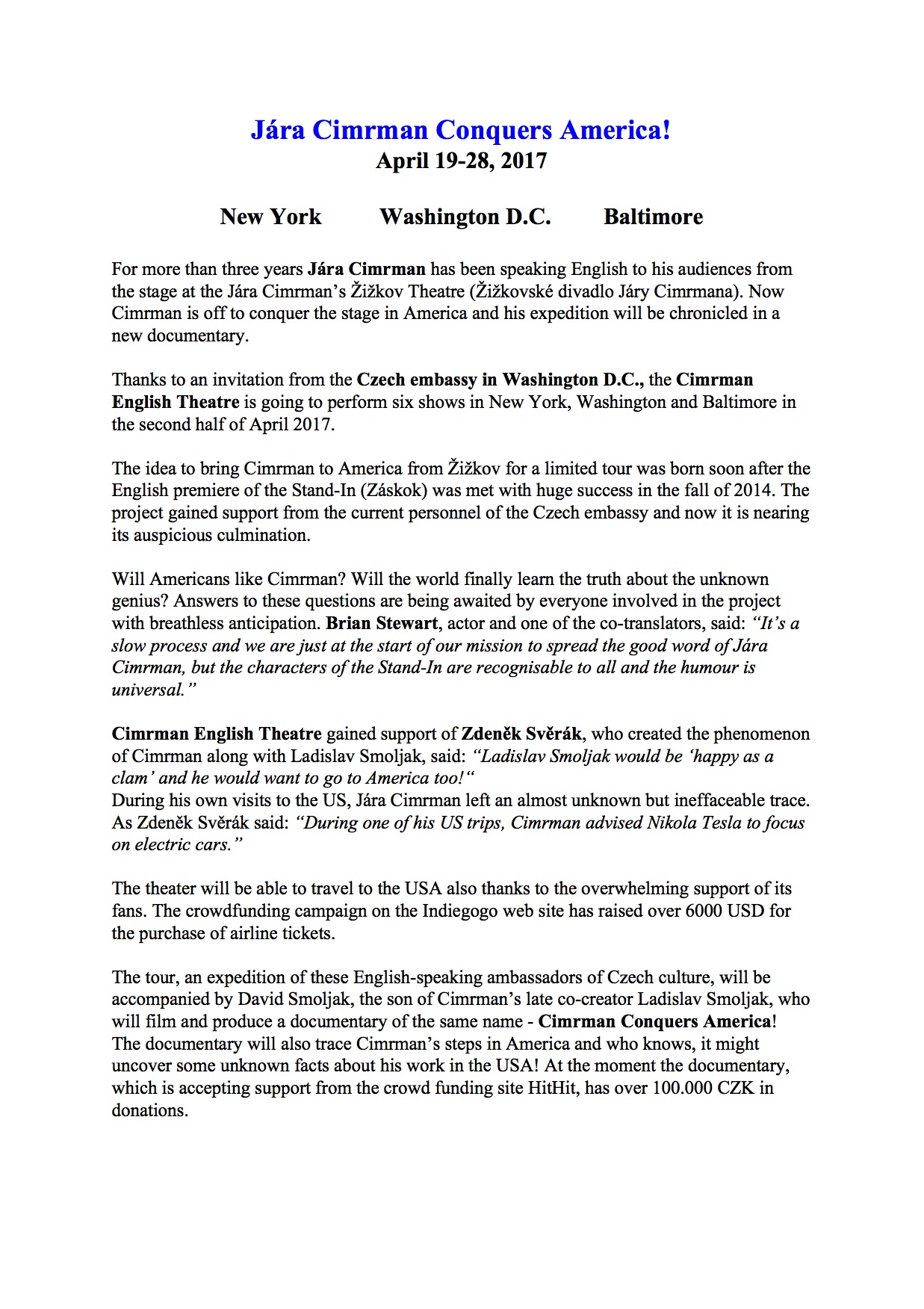 I o tomhle všem chceme v dokumentárním filmu „Cimrman dobývá Ameriku“ vyprávět. Nebude to jednoduché… Nevezeme s sebou žádný štáb. Tágo bude držet, kdo bude mít zrovna volné ruce, světla zajistí příroda a Cimrmanova jarovka zcizená kouzelníkem z Menlo parku. Bude to naprosto neobvyklé, nepřípustné a z logiky věci neproveditelné. Jako všechno, do čeho se kdy Jára Cimrman pustil! A právě proto se na to už všichni tuze těšíme.
