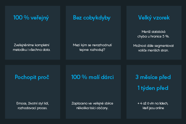 Nezávislý, dlouhodobý a detailní výzkum s přesnější behaviorální metodologií a přehledným on-line dashboardem. Žádné věštění budoucnosti, ale férový popis toho, mezi kým, jak a proč se lidé aktuálně rozhodují. Jaké mají názory? Emoce? Jak se jejich rozhodování vyvíjí? Koho nakonec opravdu volili?