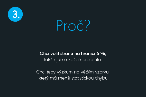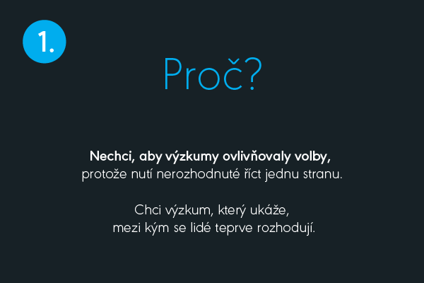 Baví nás dělat dobré výzkumy a experimenty s lidmi. V naší firmě Behavio je děláme pro firmy i veřejné instituce; třeba při jaké podobě regulace on-line hazardu lidé prohrají nejméně. A v lednu se nás hned dva z vás zeptali, jestli neuděláme "pořádný volební výzkum", že by na něj rádi přispěli. "Fakt?" Divili jsme se, ale pak nám došlo, že pořádný volební výzkum je důležitá věc, na kterou opravdu stojí za to dát pár stovek. A tak jsme to ve spolupráci s naší alma mater, katedrou sociologie FF UK, promysleli a naplánovali.