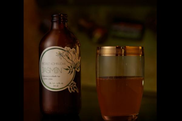 Jasmín se zeleným čajem – Květinová a svěží kombucha. Podmanivá chuť jasmínu doplněná lehkými tóny zeleného čaje s jemnou kyselinkou a trochou osvěžující svíravosti typické právě pro většinu kvalitních zelených čajů.