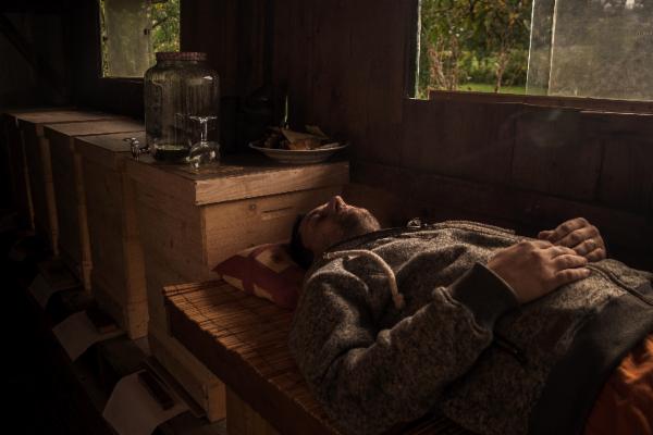 2) „Api-wellness“ s relaxačním lůžkem na 5-6 úlech pro dva s inhalátory na dýchání desinfikujícího a excitujícího úlového vzduchu. V této části jsou umístěny i skleněné nádoby, ve kterých se potencuje voda včelími vibracemi a získává tak novou vitální kvalitu.