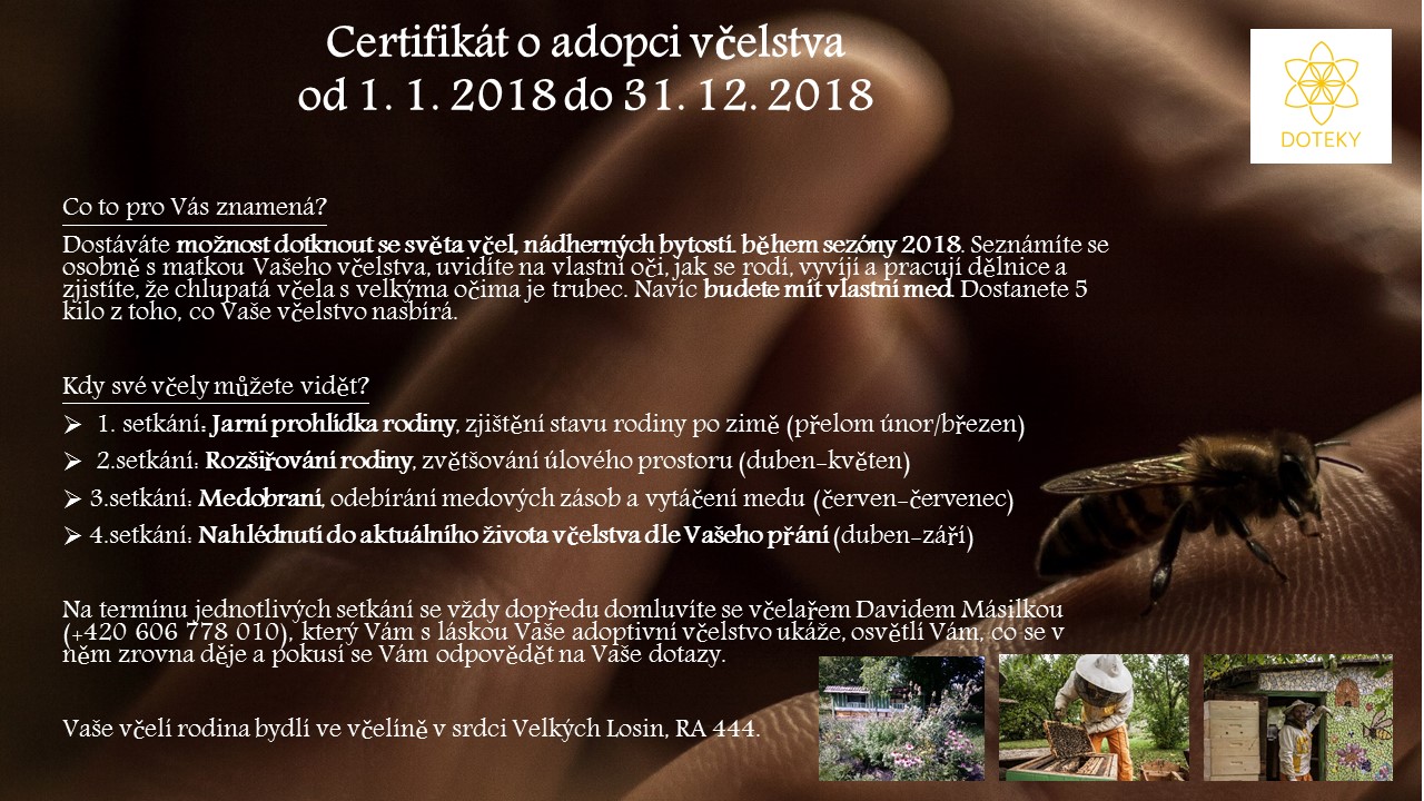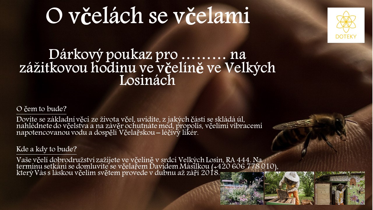 Pokud chcete též darovat zážitkovou hodinu „O včelách se včelami“ pro rodinu, adopci úlu pro rok 2018 nebo si předobjednat Včelařskou – léčivý likér atd., neváhejte se ozvat. V neveřejné podobě s projektem pokračuji ve svém stávajícím včelíně v srdci lázeňské obce Velké Losiny a pokud to půjde, rád Vám vyjdu vstříc.
