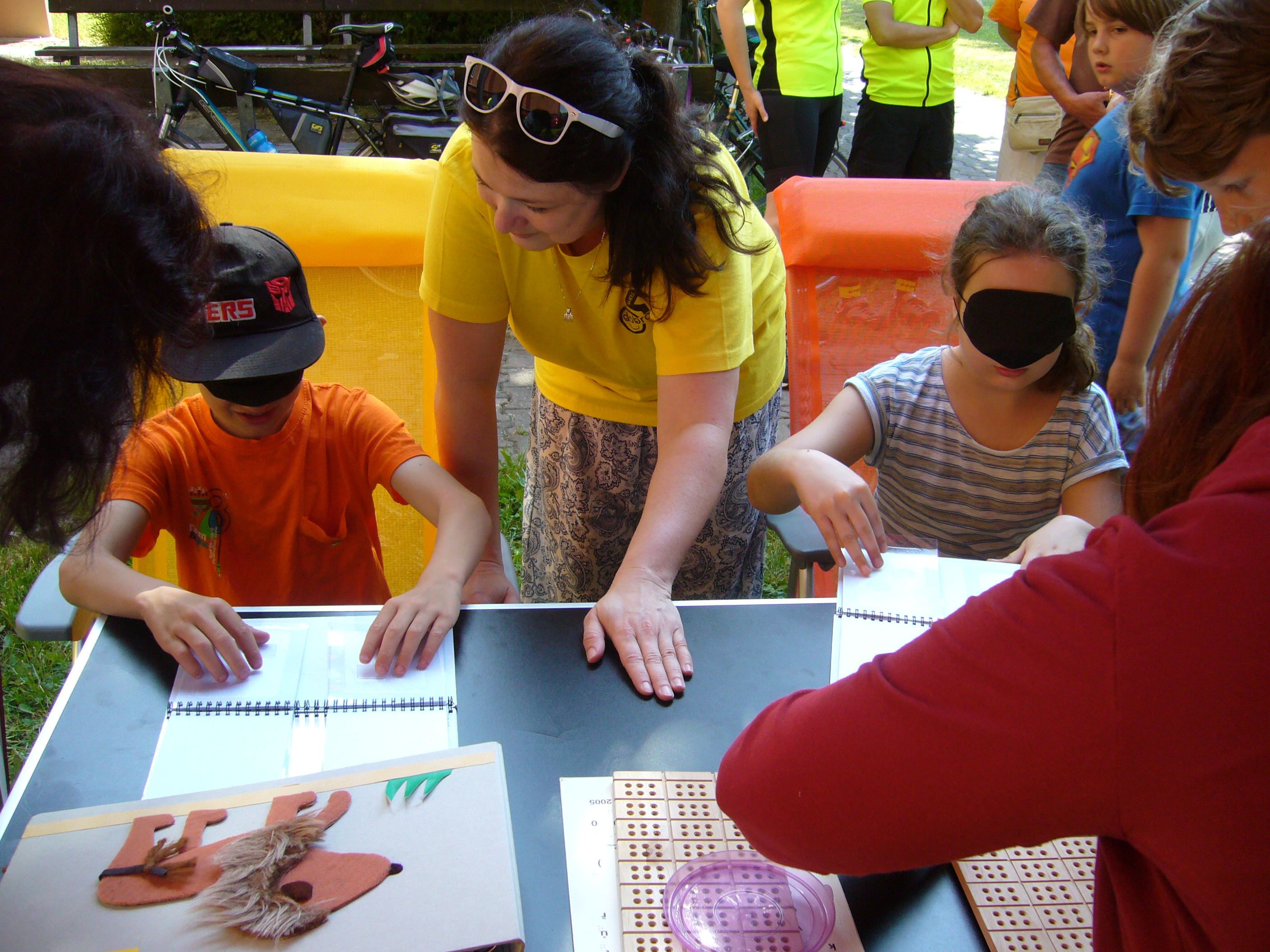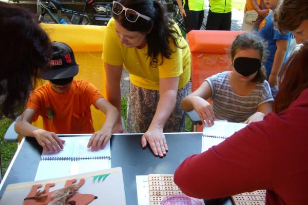 Nezůstáváme jen u audioknih samotných, věnujeme se i osvětě – v našem interaktivním stánku si kolemjdoucí mohou zkusit vyřešit různé hmatolamy, poskládat si skládačku nebo napsat něco Braillovým písmem, to vše jen za pomoci hmatu a sluchu.