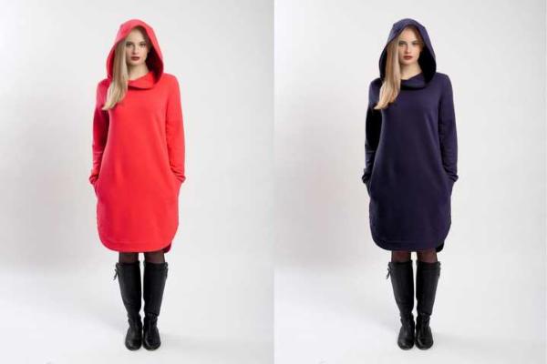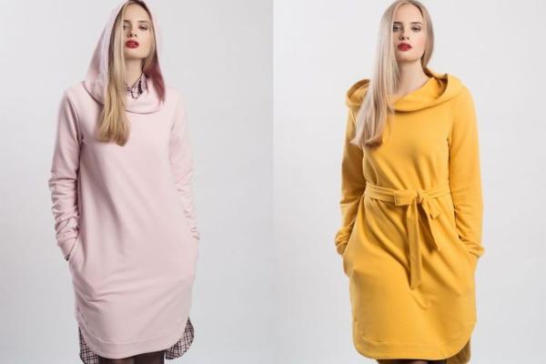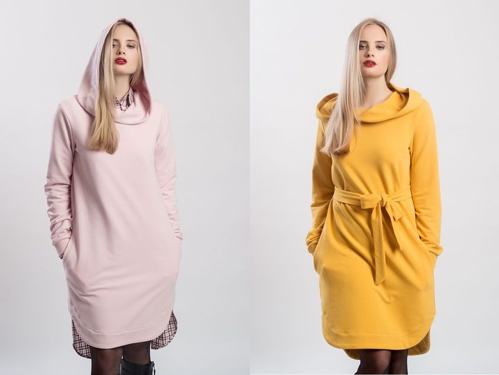 Teplákové mikino-šaty v úžasné růžové, šafránově žluté barvě, červené a tmavě modré z jemné elastické teplákoviny z certifikované bavlny. Materiál je vyroben v České republice.