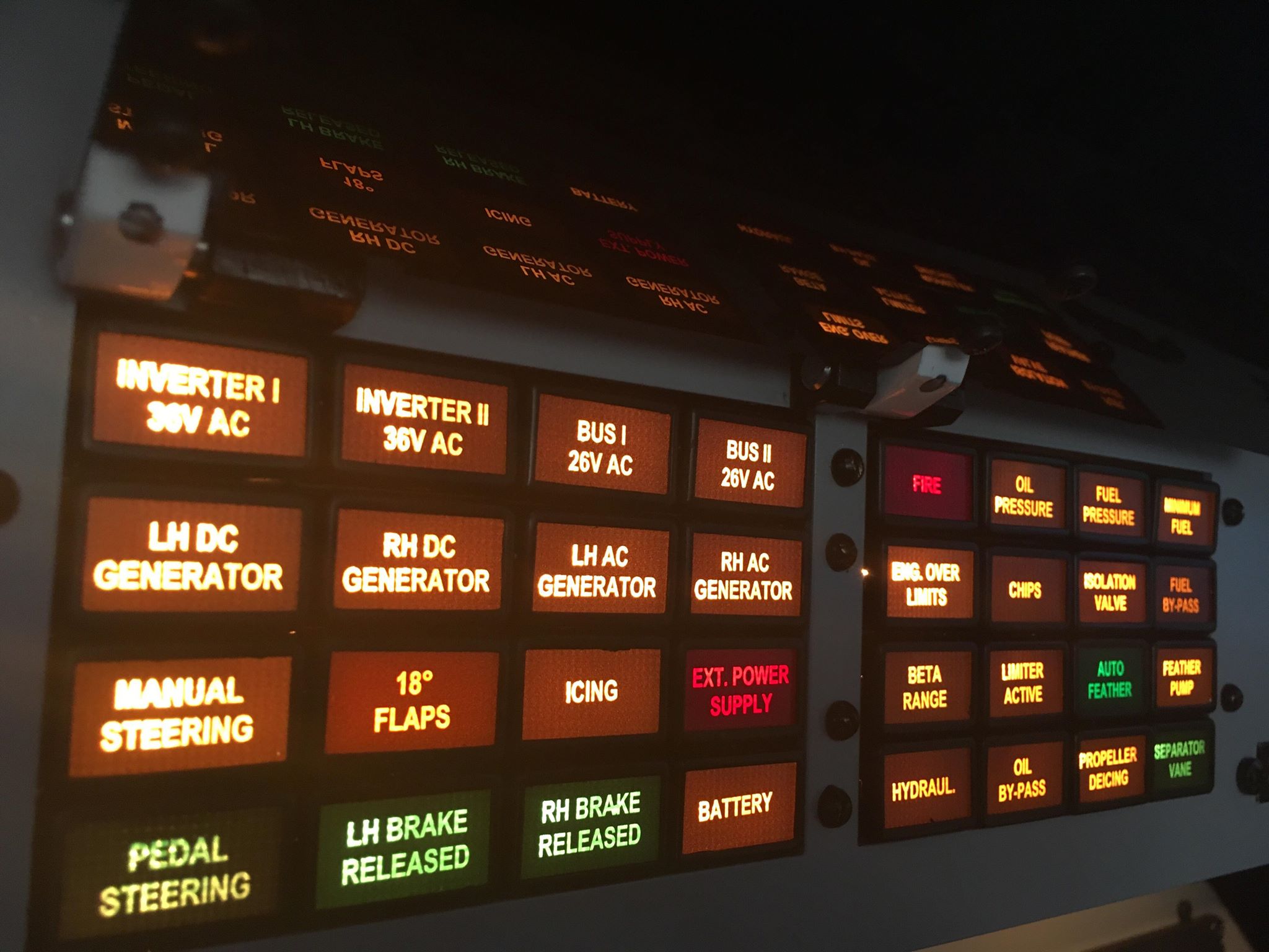 Na letadle neustále pracujeme aby byl Váš letecký zážitek co nejhlubší. Nejnovějším přírustkem jsou oživená výstražná tabla. Ty dávají pilotovi informace o stavu jednotlivých systémů letounu. Tak třeba, že jste si zapomněli vysunout vztlakové klapky před vzletem, nebo například při poklesu tlaku oleje v jednom z motorů. Níže na fotce jsou v režimu testu před startem, kdy svítí všechny aby bylo poznat zda některá signálka není prasklá. Naším cílem je držet kokpit v co nejoriginálnějším stavu, takže podsvětlení zajišťují 28V žárovičky, které krásně topí.