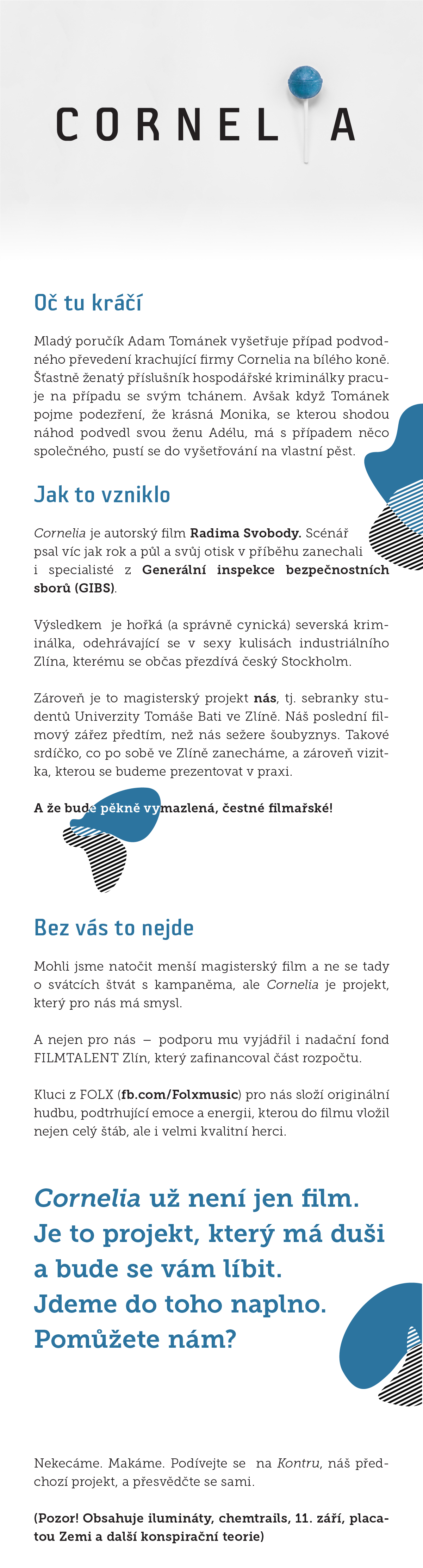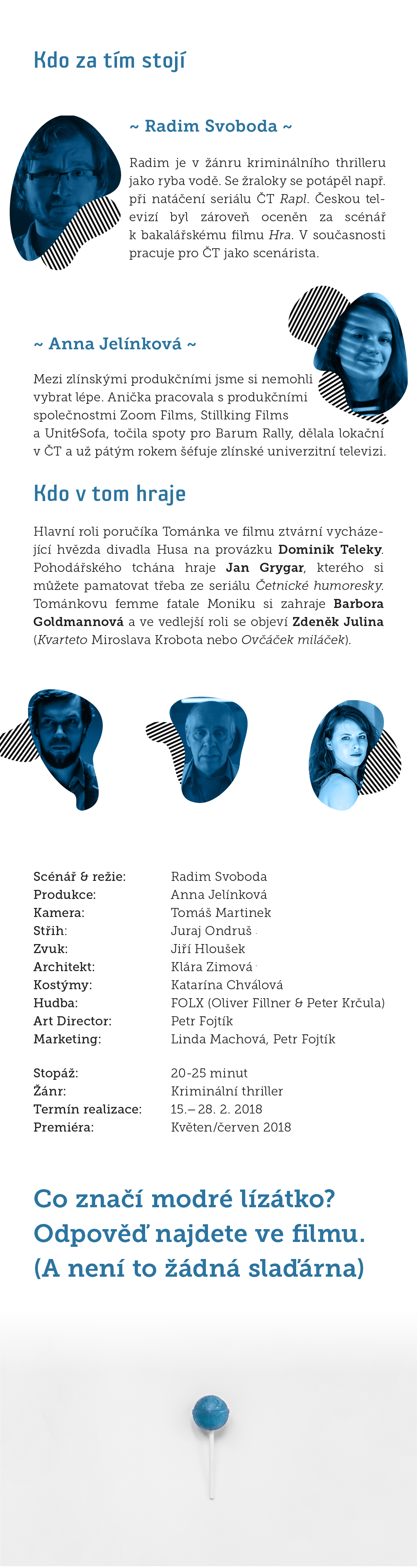 Tenhle film nebude žádná slaďárna, ale pořádně cynická kriminálka z prostředí baťovských domků a továren. Podpořte její vznik a odhalte tajemství modrého lízátka.