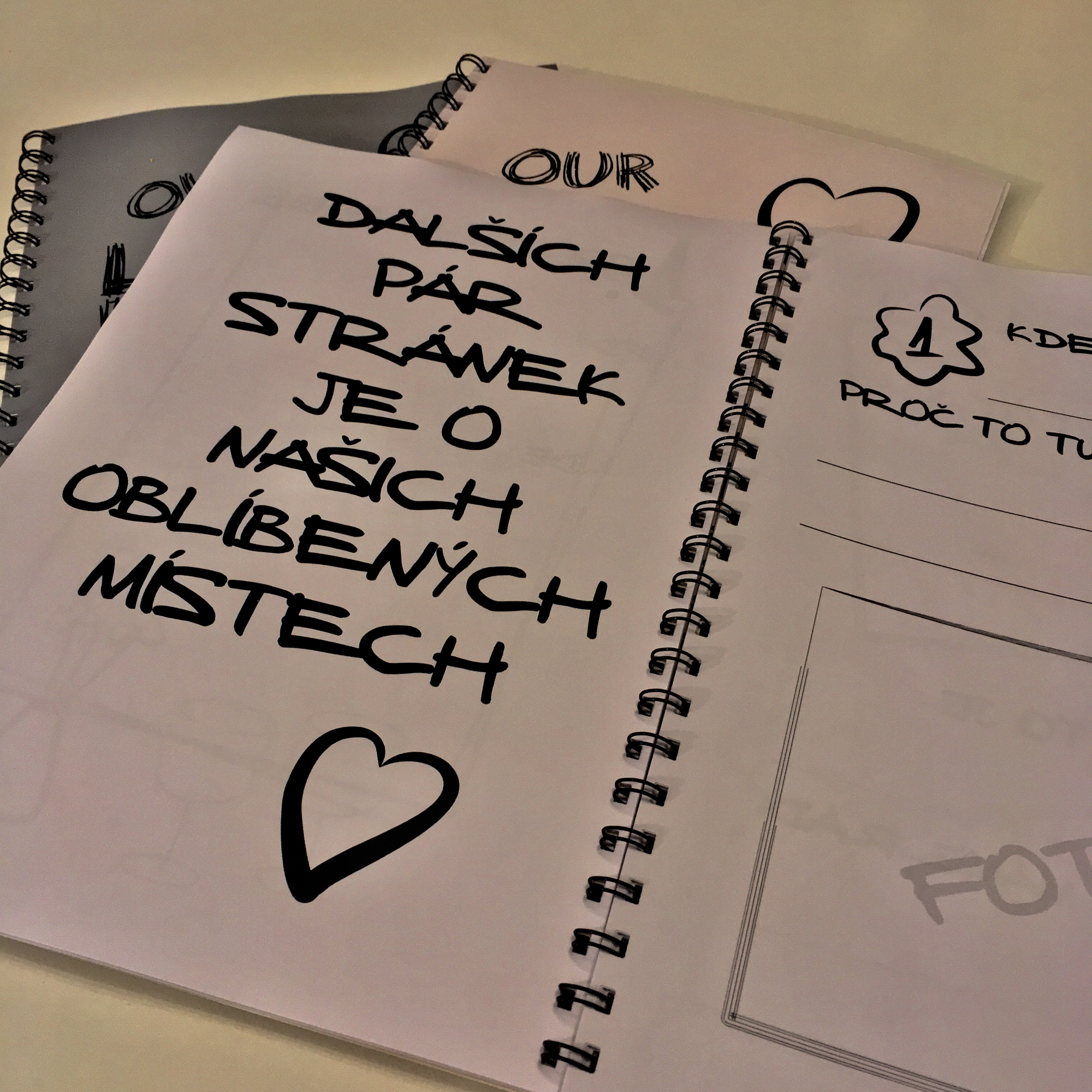 Knížka je velice jednoduše a originálně ilustrovaná a myslíme, že by měla být nedílnou součástí káždého zamilovaného páru. Uvnitř najdete spoustu místa pro Vaše společné fotografie, stránky věnované Vašim společným plánům do budoucna a stránek na vzpomínaní a zaznamenávání Vašich prvních společných aktivit, oblíbených míst, písní, filmů, atd. Nemusíte se bát, mysleli jsme i na ty zapomnětlivější a máme tu místo i pro zapsání datumu Vašeho výročí :)