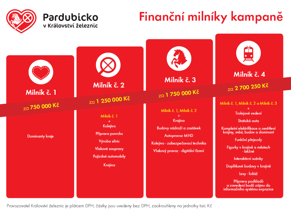 4 milníky se liší mírou detailů provedení a obsahu, v závislosti na výši získaných prostředků. Našim partnerům (tedy vám, kteří koupí některé z odměn podpoříte náš společný projekt), nabízíme širokou paletu hravých, užitečných, ale i naprosto "ustřelených" produktů a zážitků (třeba i vašeho dvojníka v kolejišti...) Vyberte si a pojďte s námi do toho!