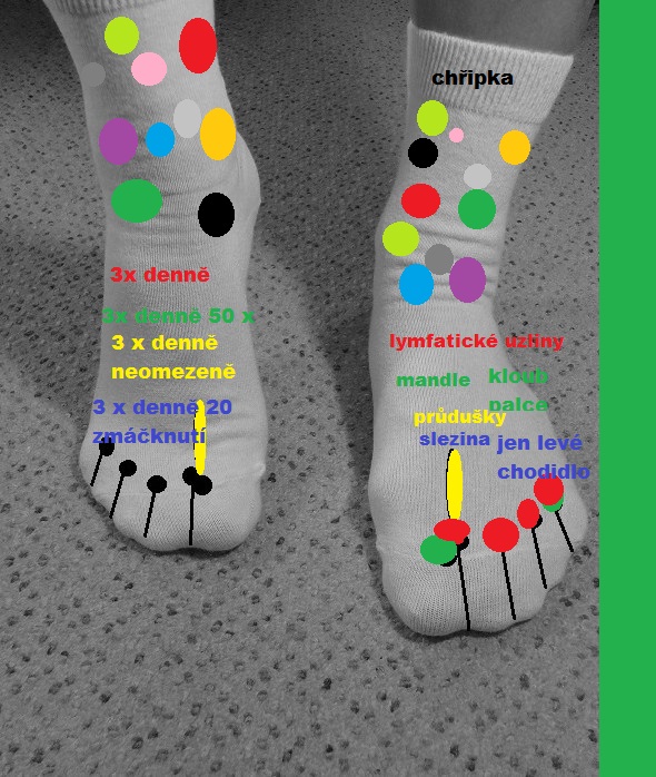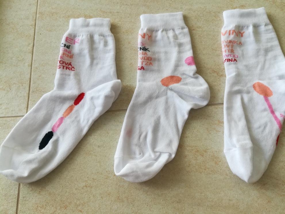 Toto jsou troje zkušební ponožky. V této fázi neřeším barvy ani písmo, ale jak se tam body vejdou a jestli jsou dobře umístěné. Ponožky: na páteř, pro ženy a močové ústrojí.
