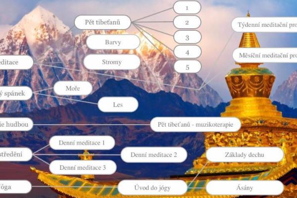 Doba pokročila a tak nás napadlo rozšířit tým o šikovného vývojáře aplikací pro mobilní telefony a další odborníky na meditační techniky a vytvořit zásadně zdokonalenou interaktivní verzi popularizace tohoto tématu. Pod názvem Pět tibeťanů bychom rádi vytvořili a přes AppStore (iPhone, iPad, iWatch) distribuovali nejen jakýsi relaxační set vizuálů s terapeutickou hudbou, ale i návody na užitečná dechová cvičení na bázi jógy a časové harmonogramy antistresových programů. Verze pro Android bude samozřejmě rychle následovat! Náš předpoklad je, že zhruba do měsíce od uvedení iOS verze umístíme na Google Play i verzi pro Android. Na obrázku je základní struktura celé aplikace v přehledné grafice.