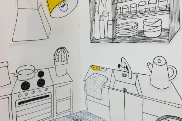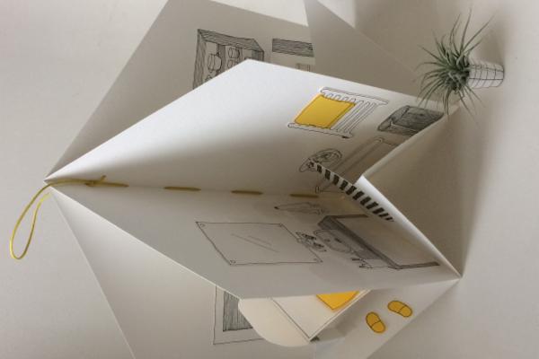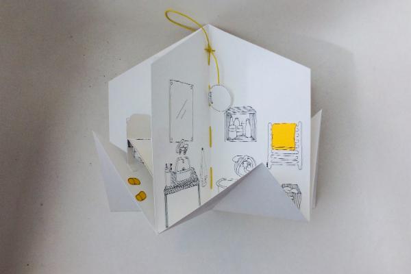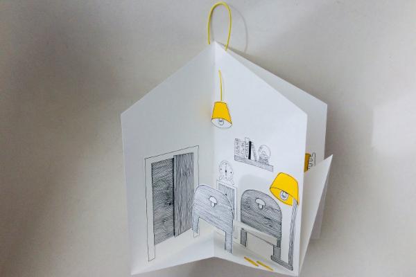 Každý domeček ( limitovaný počet kusů 30) budu ručně vyrábět a sešívat žlutým provázkem. Takto připravený domeček pošlu majiteli. Ten si bude moct vystříhat vybavení a zabydlet se v domečku podle své libosti. Pokojíček, koupelna a kuchyň.