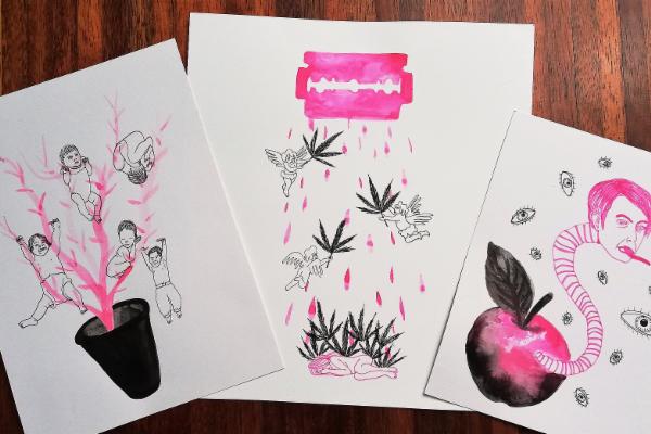 Kateřina Barabášová je mladá malířka, která pro svou originální tvorbu čerpá inspiraci z témat všedního života. Reaguje na aktuální události ve společnosti. Nebojí se vyjádřit kontrasty, monstra i groteskní aspekty života. Pro PLODNOU VIZI během devíti měsíců vytvořila sadu ilustrací, které podtrhují dějovou linku příběhů.