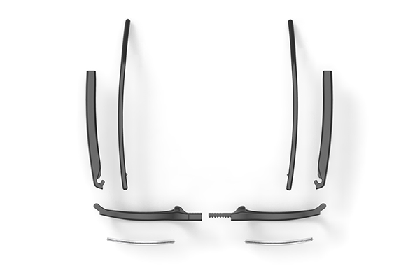 Obroučky jsou sestaveny z modulů, které do sebe jednoduše zapadají a v terénu je složíte během několika minut. Délka koncových stranic je nastavitelná, aby brýle dobře seděly na (všech) uších a nastavitelný je i nosník, aby se jeho délka dala upravit podle různých vzdáleností zornic. Hodnota představující vzdálenost mezi středy zornic je totiž klíčový údaj uživatelů dioptrických brýlí.