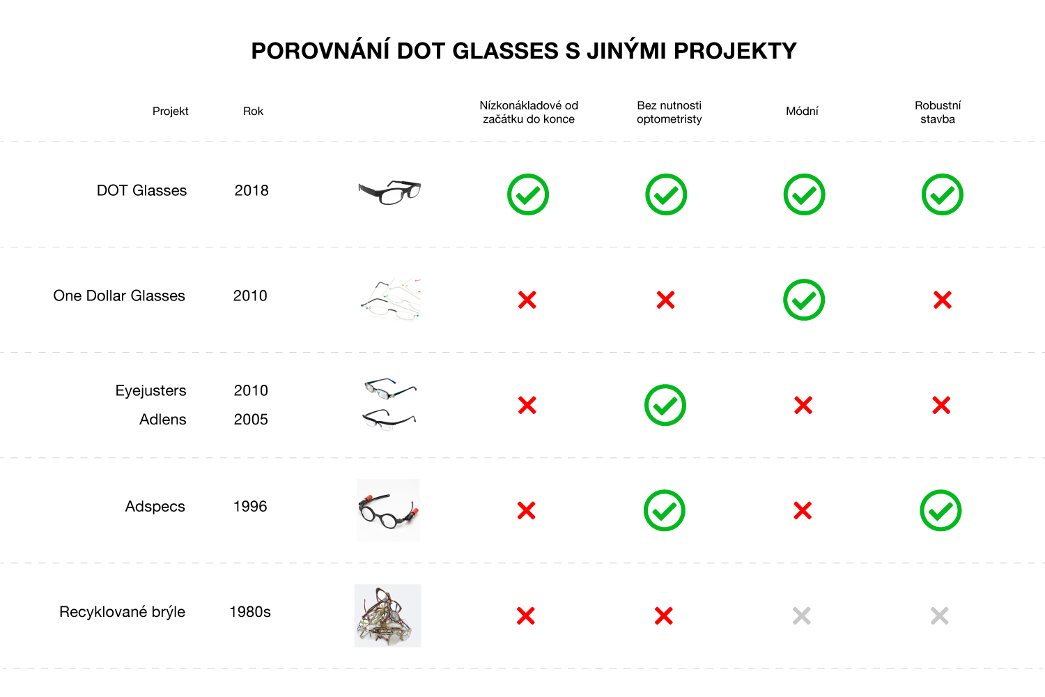 Jsme přesvědčeni, že s našimi inovativními návrhy, zjednodušenými procesy a vůbec celkovou filozofií maximálního zjednodušení budeme schopni dioptrické brýle DOT Glasses nabídnout všem, kdo je potřebují. Kombinujeme totiž nízké výrobní náklady, zjednodušenou logistiku a diagnostiku bez nutnosti očního lékaře. Budeme-li úspěšní, bude jeden pár dioptrických brýlí stát kolem 1 dolaru.